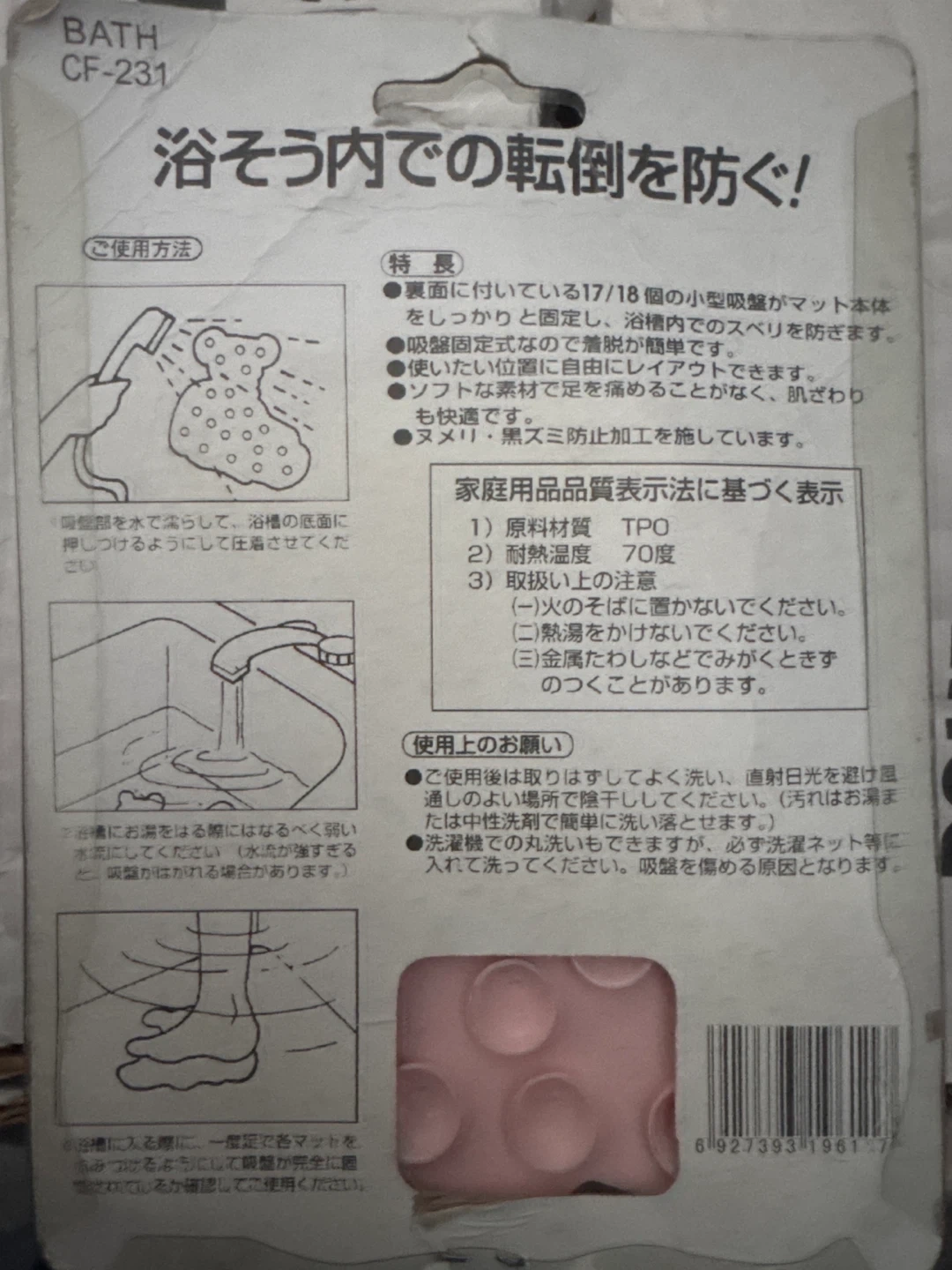This bath mat grip helps prevent slipping in the bath. It's made with soft material for comfortable foot contact. Its non-slip design is great for safety.