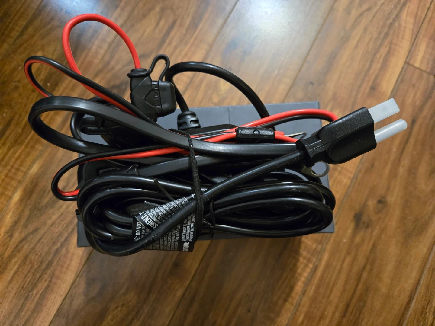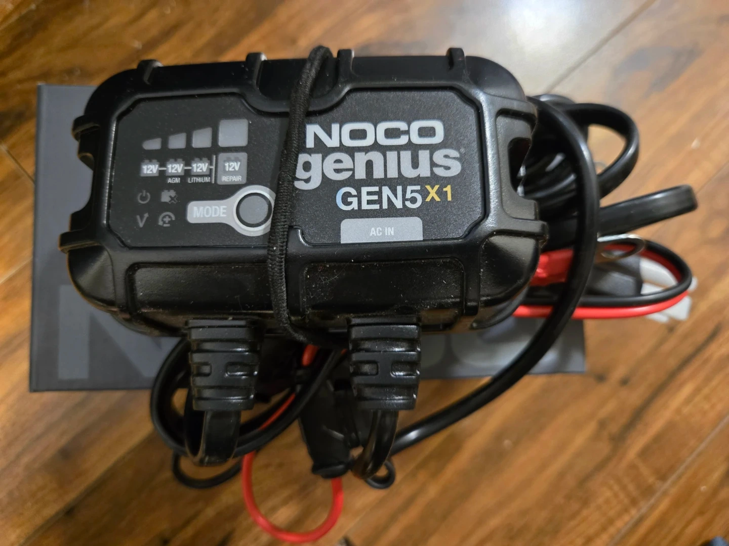 This is a NOCO Genius GEN5X1 12V battery charger. It's designed for lead-acid and lithium batteries. Useful for maintaining vehicle batteries.