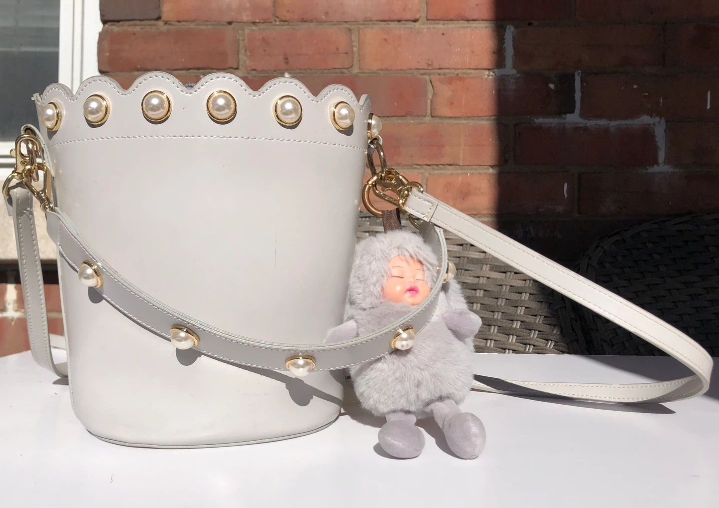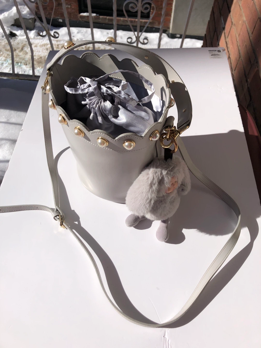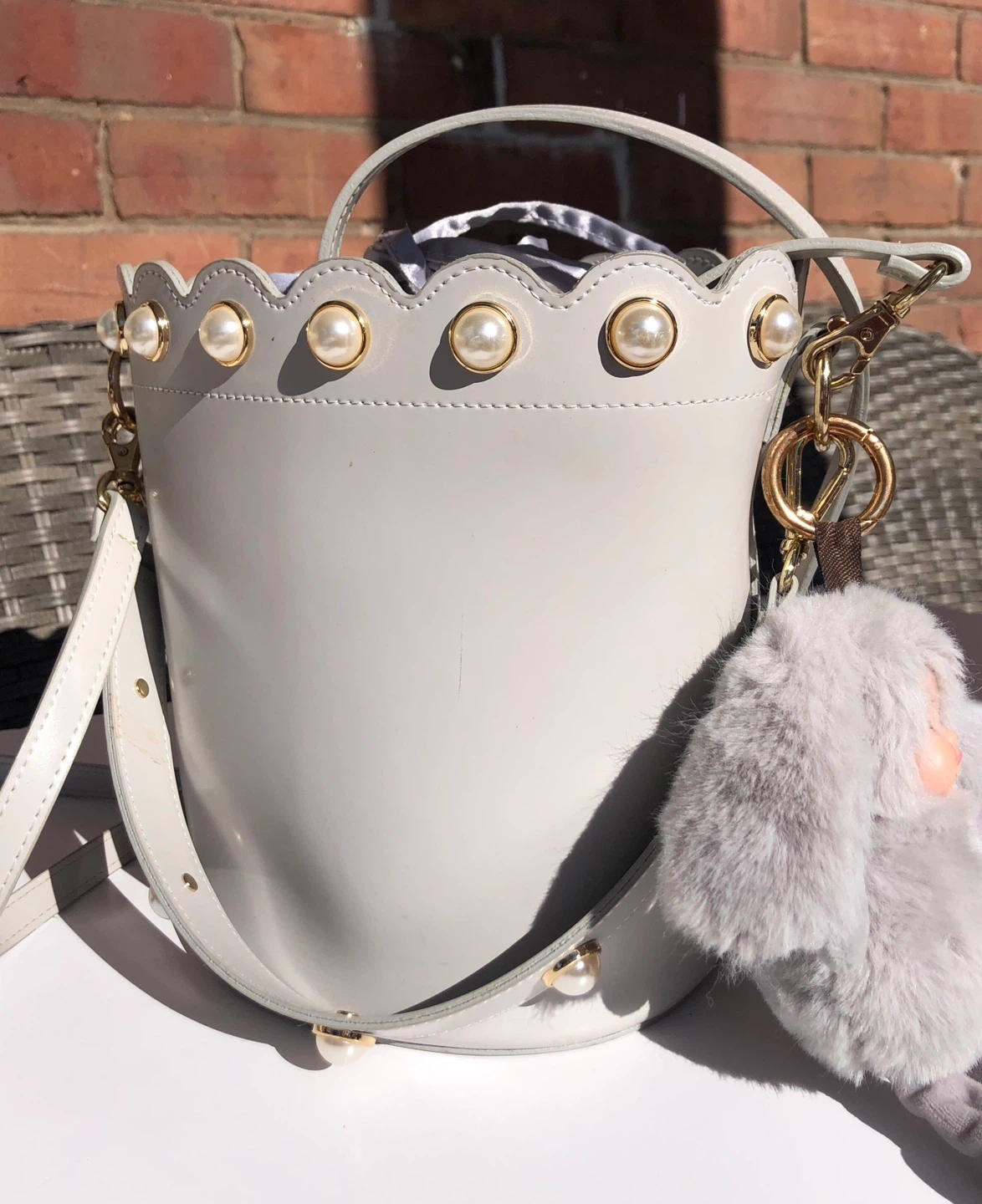 This grey bucket bag has a scallop edge adorned with pearls. It comes with a detachable shoulder strap and a fuzzy bunny charm.