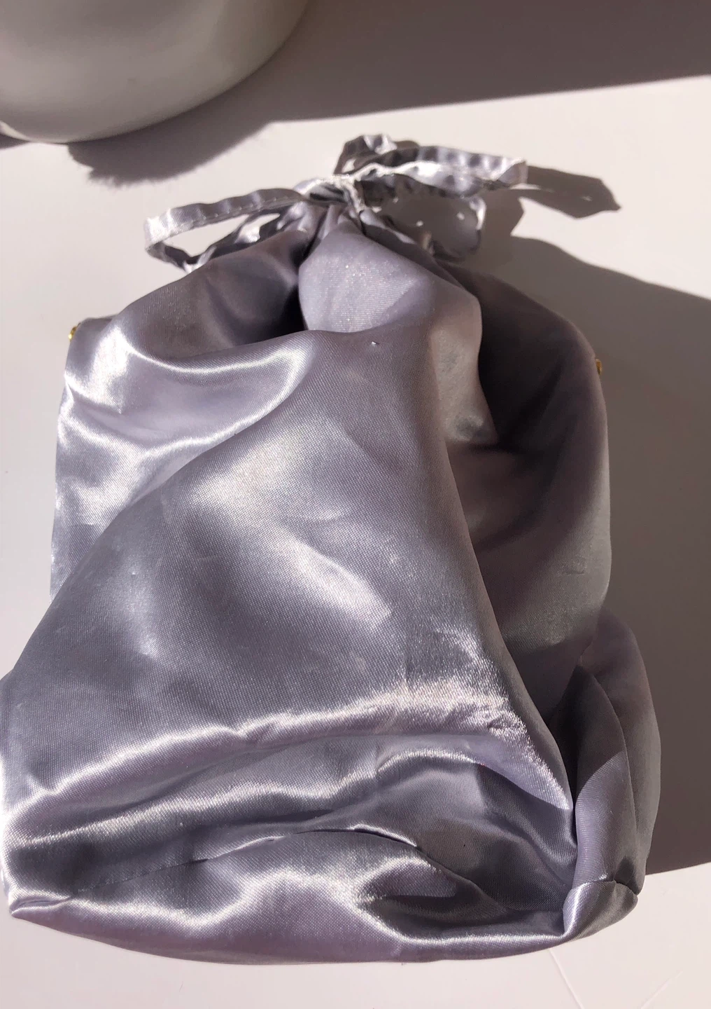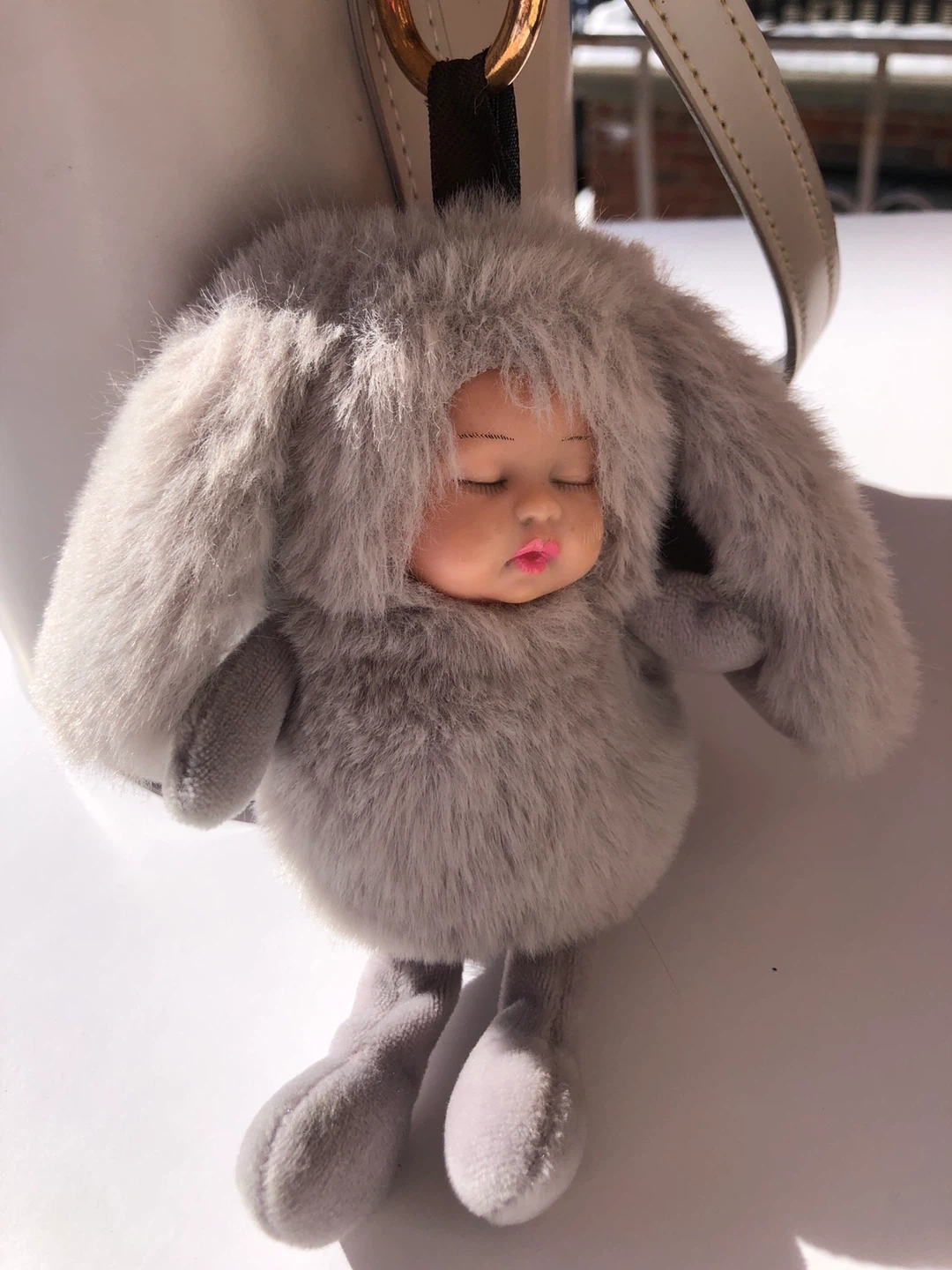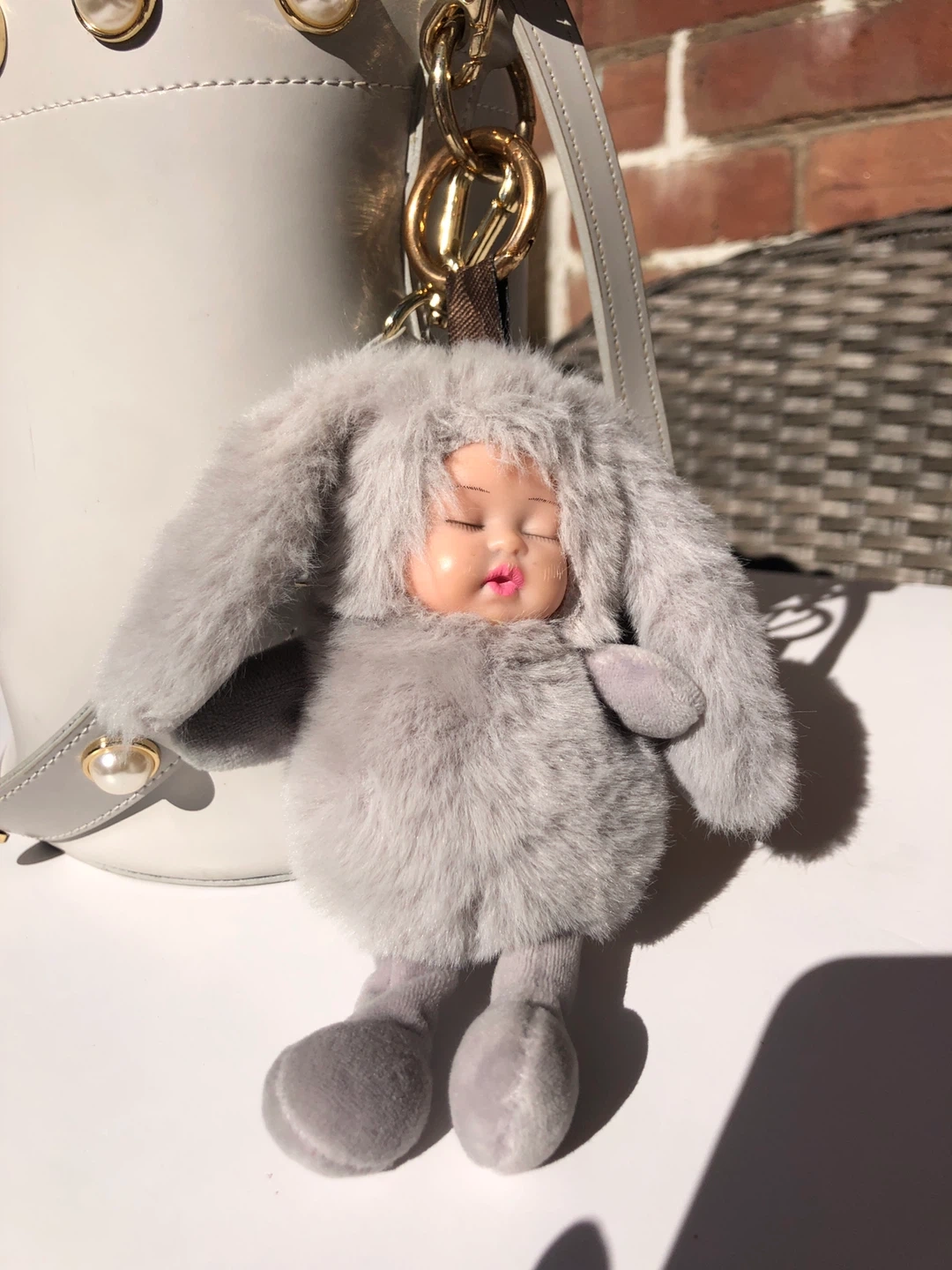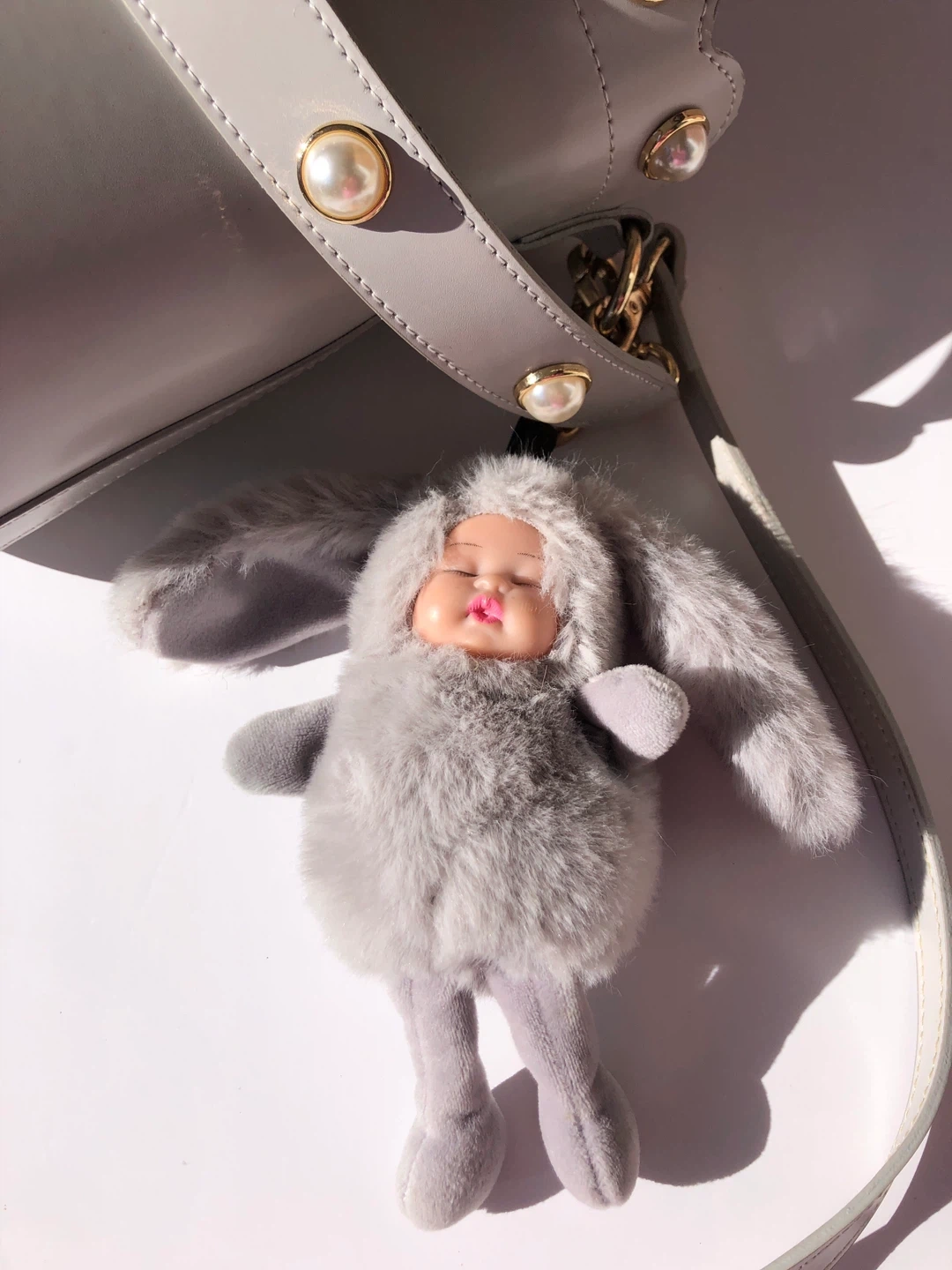 This grey bucket bag has a scallop edge adorned with pearls. It comes with a detachable shoulder strap and a fuzzy bunny charm.