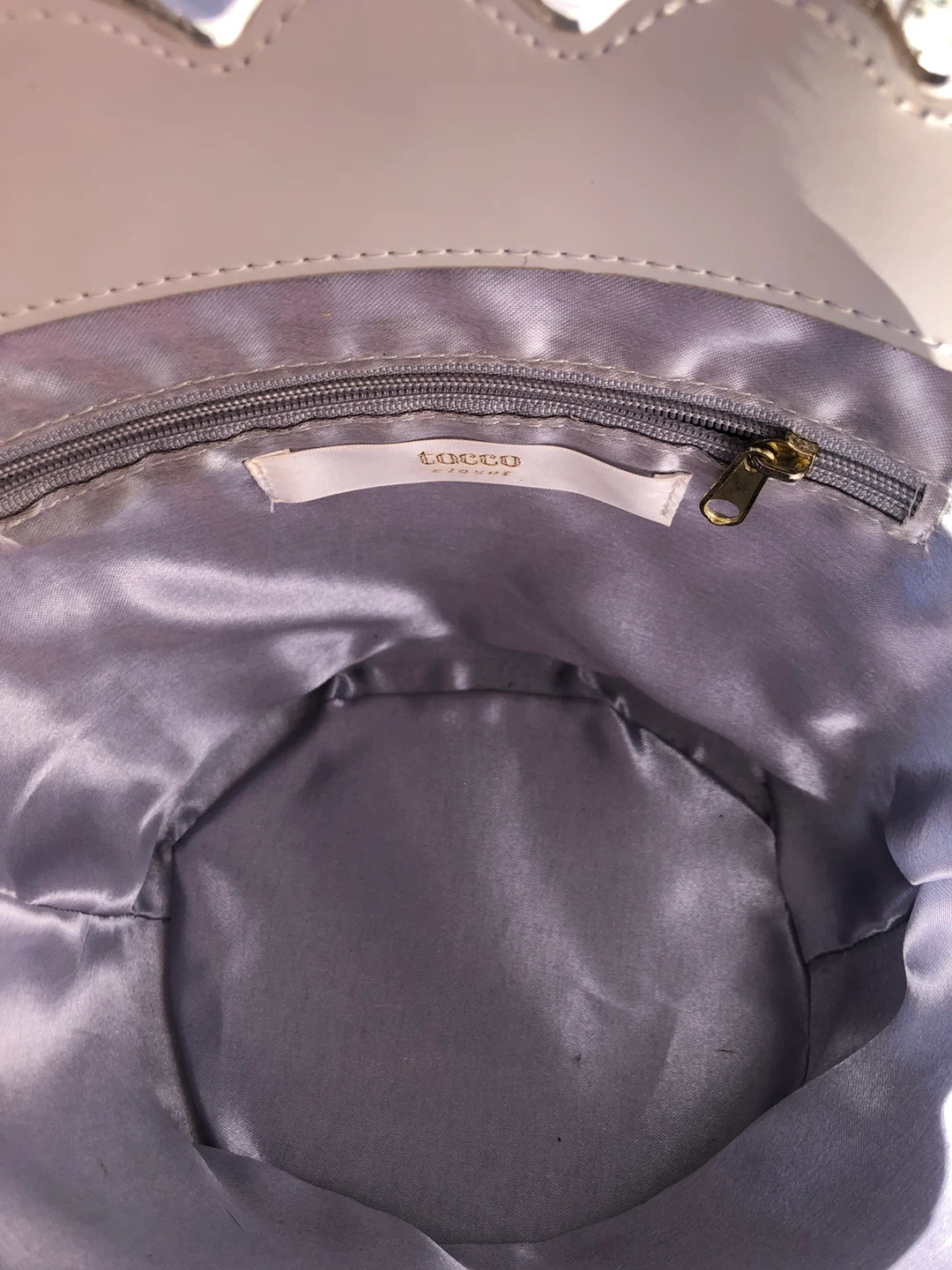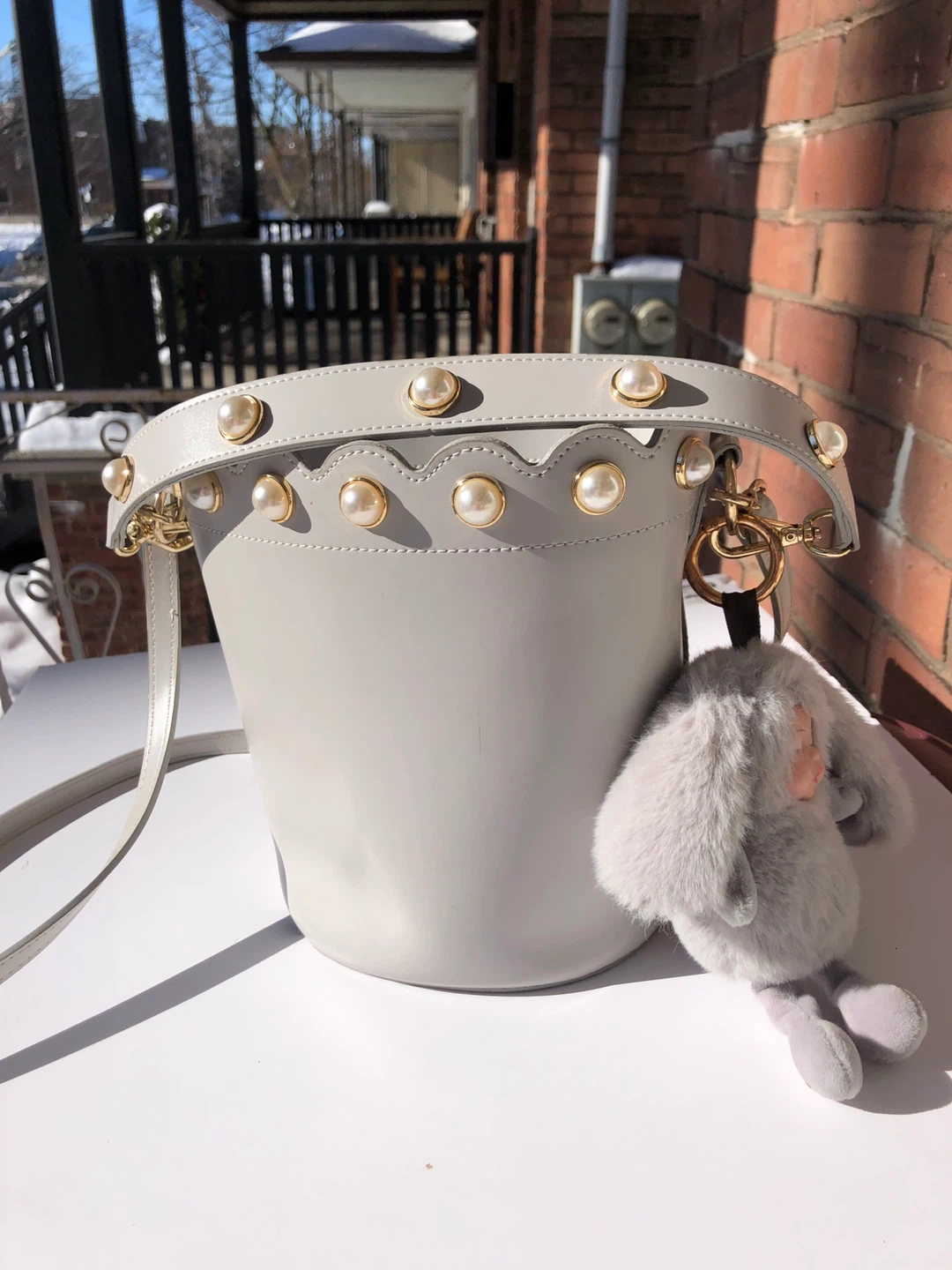 This grey bucket bag has a scallop edge adorned with pearls. It comes with a detachable shoulder strap and a fuzzy bunny charm.