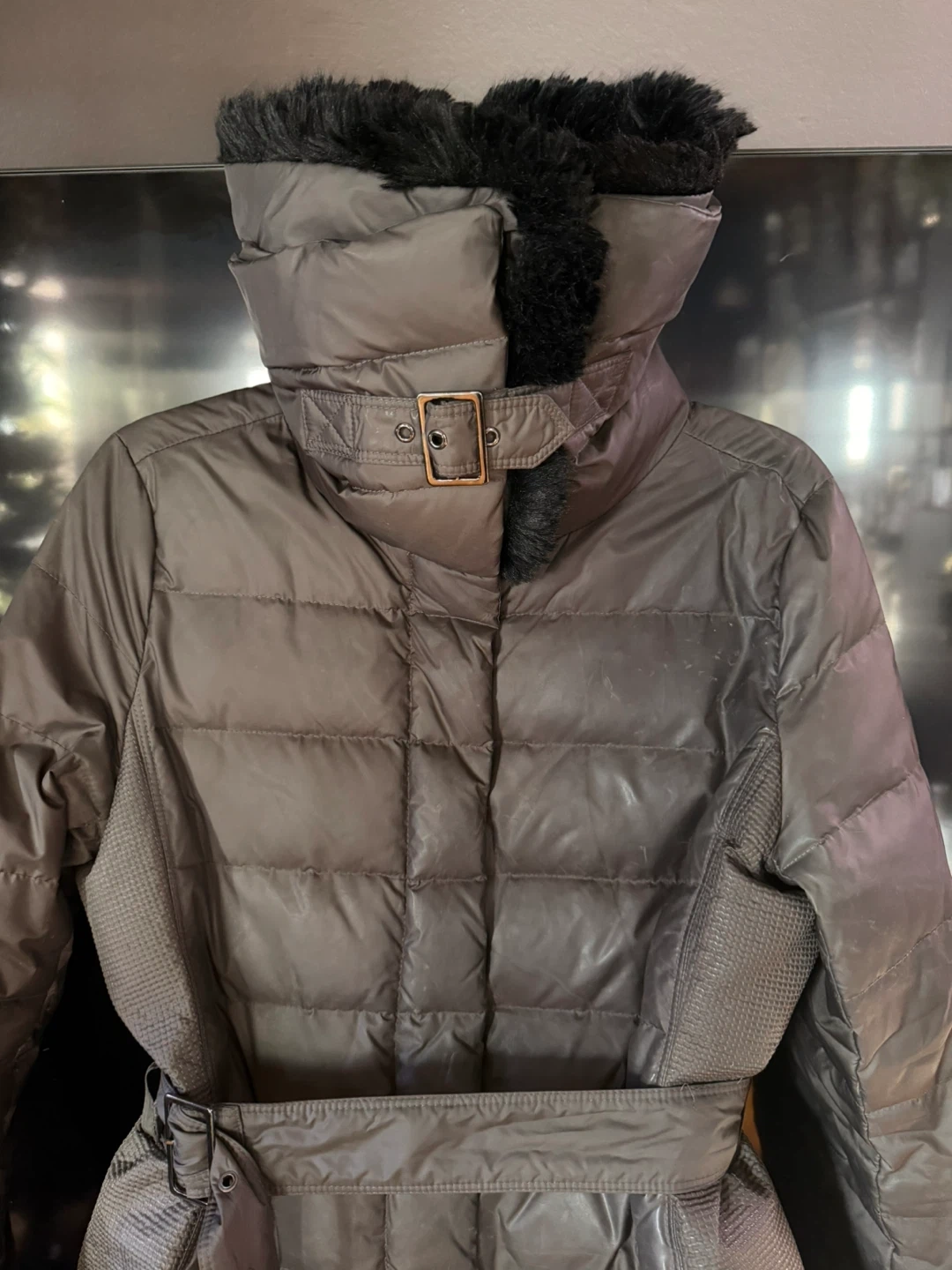 “Women's” Medium London Fog Heritage puffer coat with faux fur collar. Shell is 100% polyester with quilted down and feather fill. Features a belt at the waist and snap button closure.