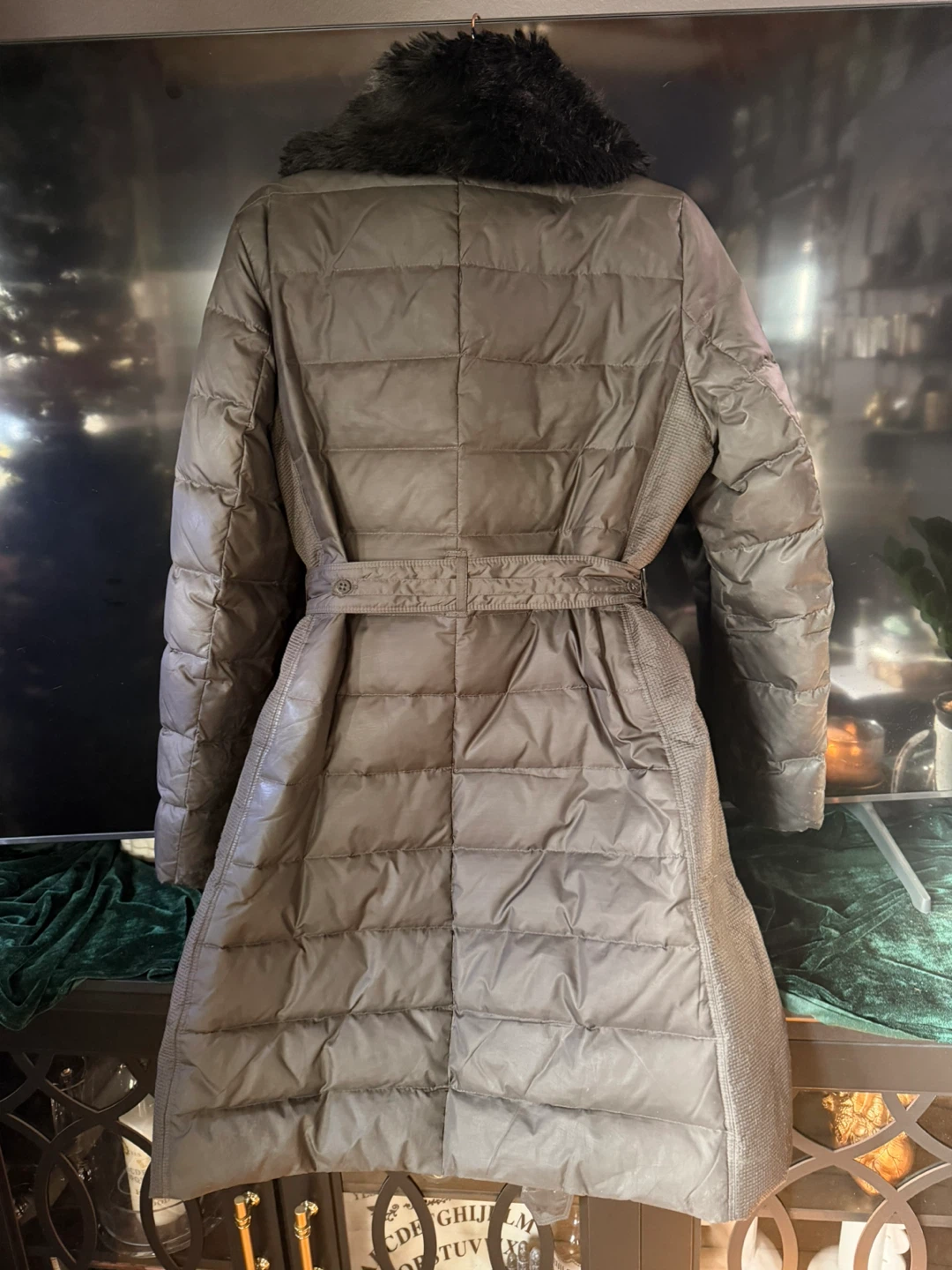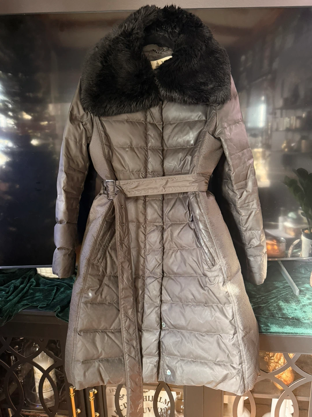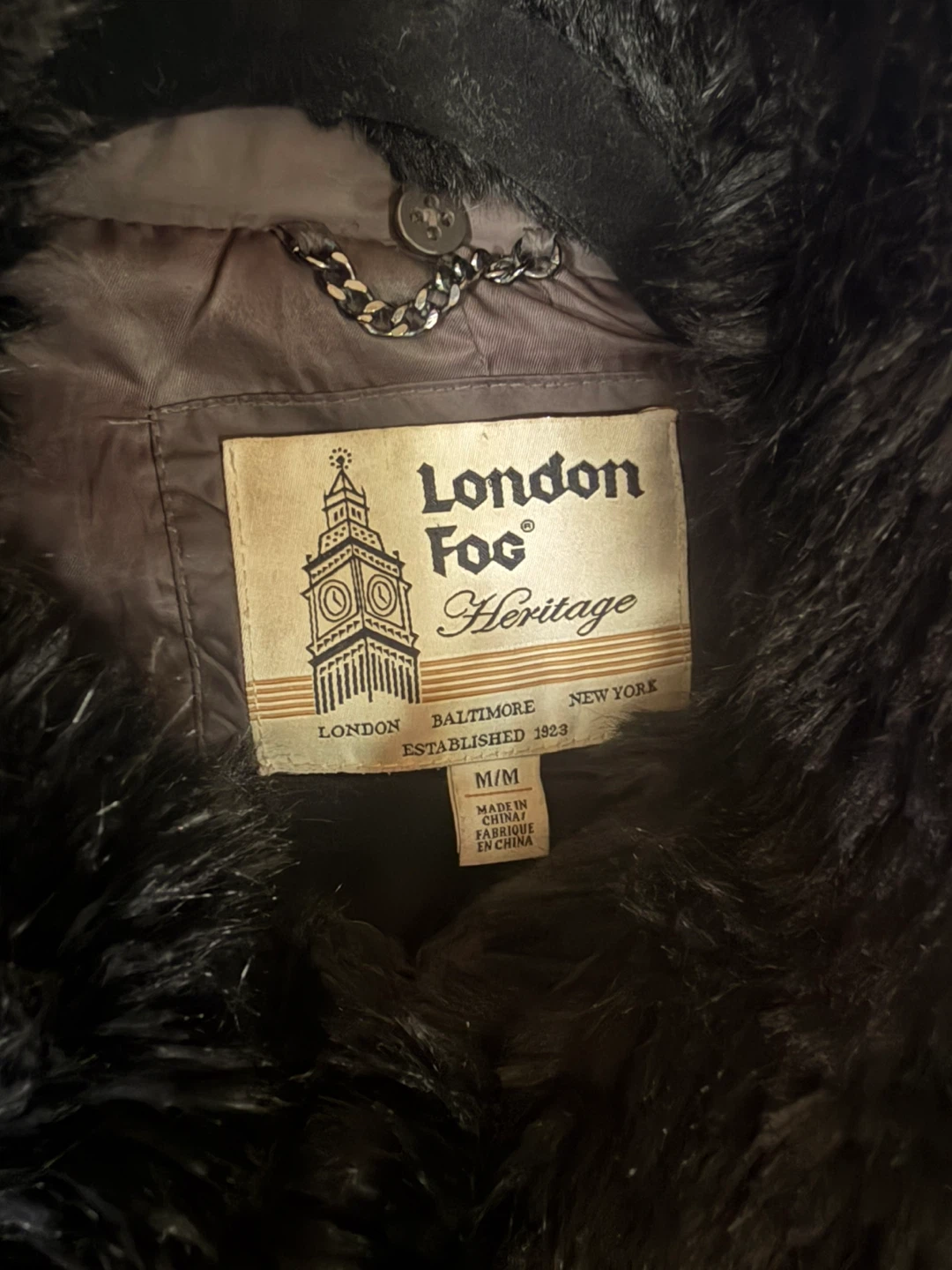 “Women's” Medium London Fog Heritage puffer coat with faux fur collar. Shell is 100% polyester with quilted down and feather fill. Features a belt at the waist and snap button closure.