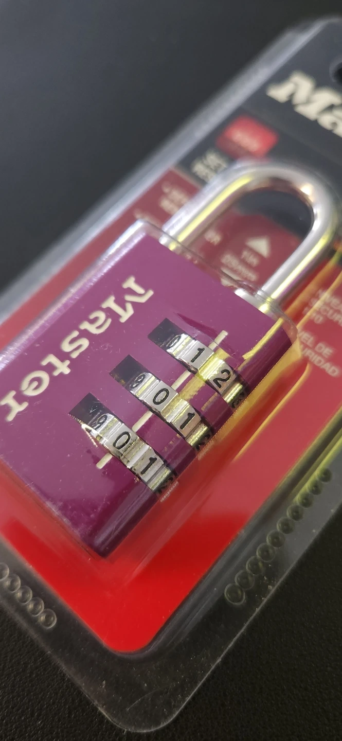 This is a Master Lock 3-digit combination padlock in purple. It has a 1 inch (25mm) shackle and a security level of 1-10. It's brand new in its original packaging.