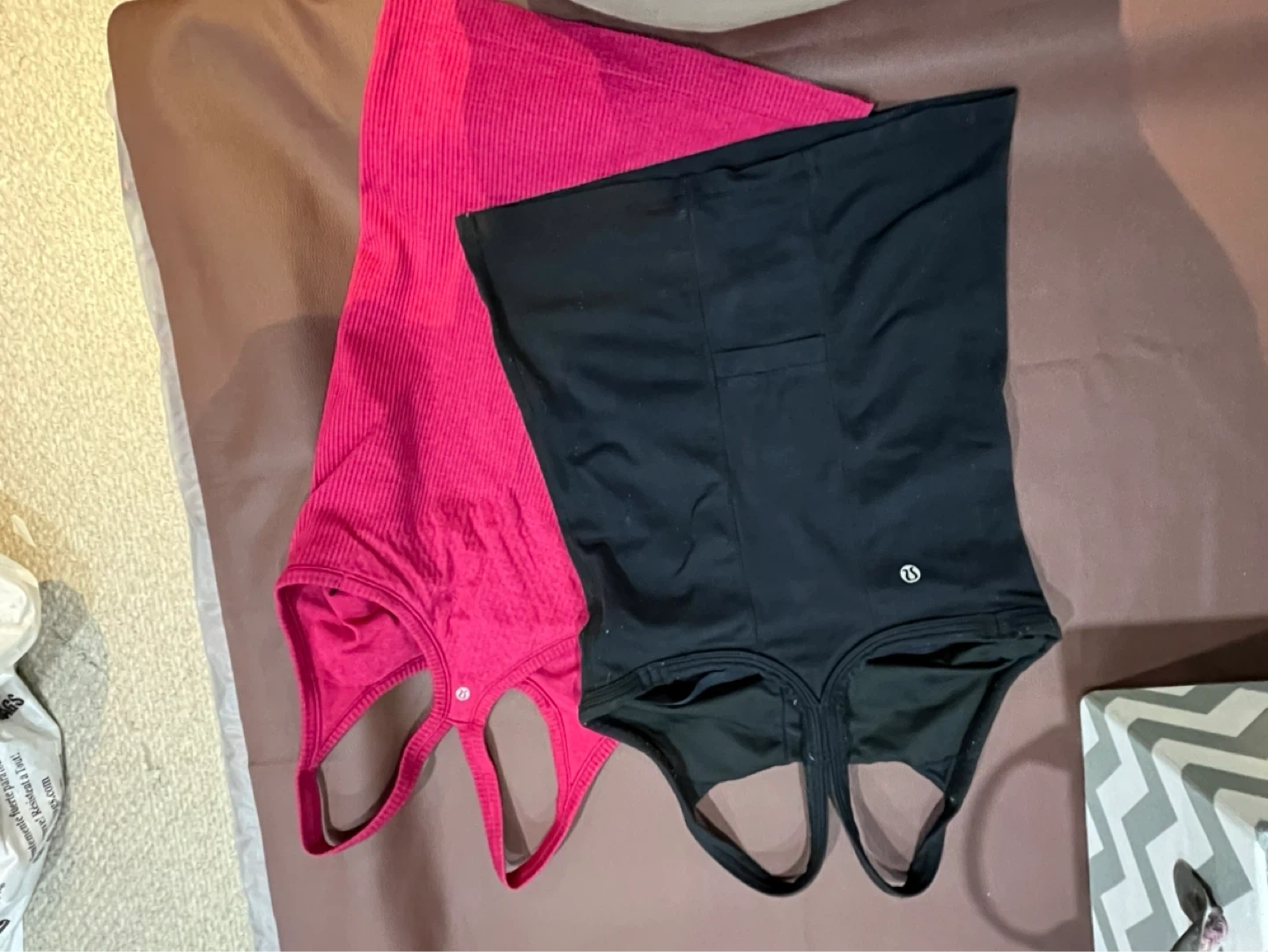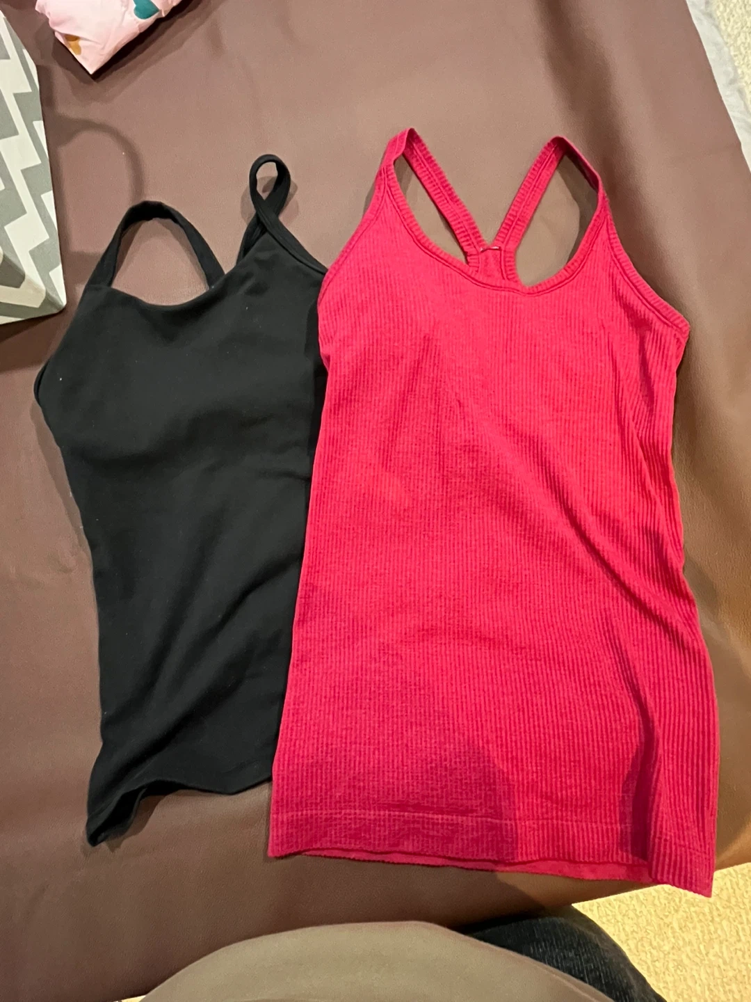 Two Lululemon tank tops, one black and one red . Tags have been cut off but they are Both are size 4, I can’t find the size on the red one