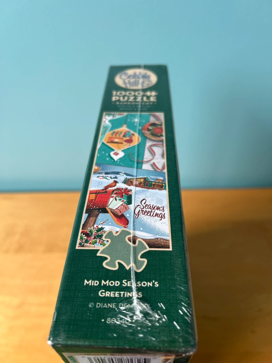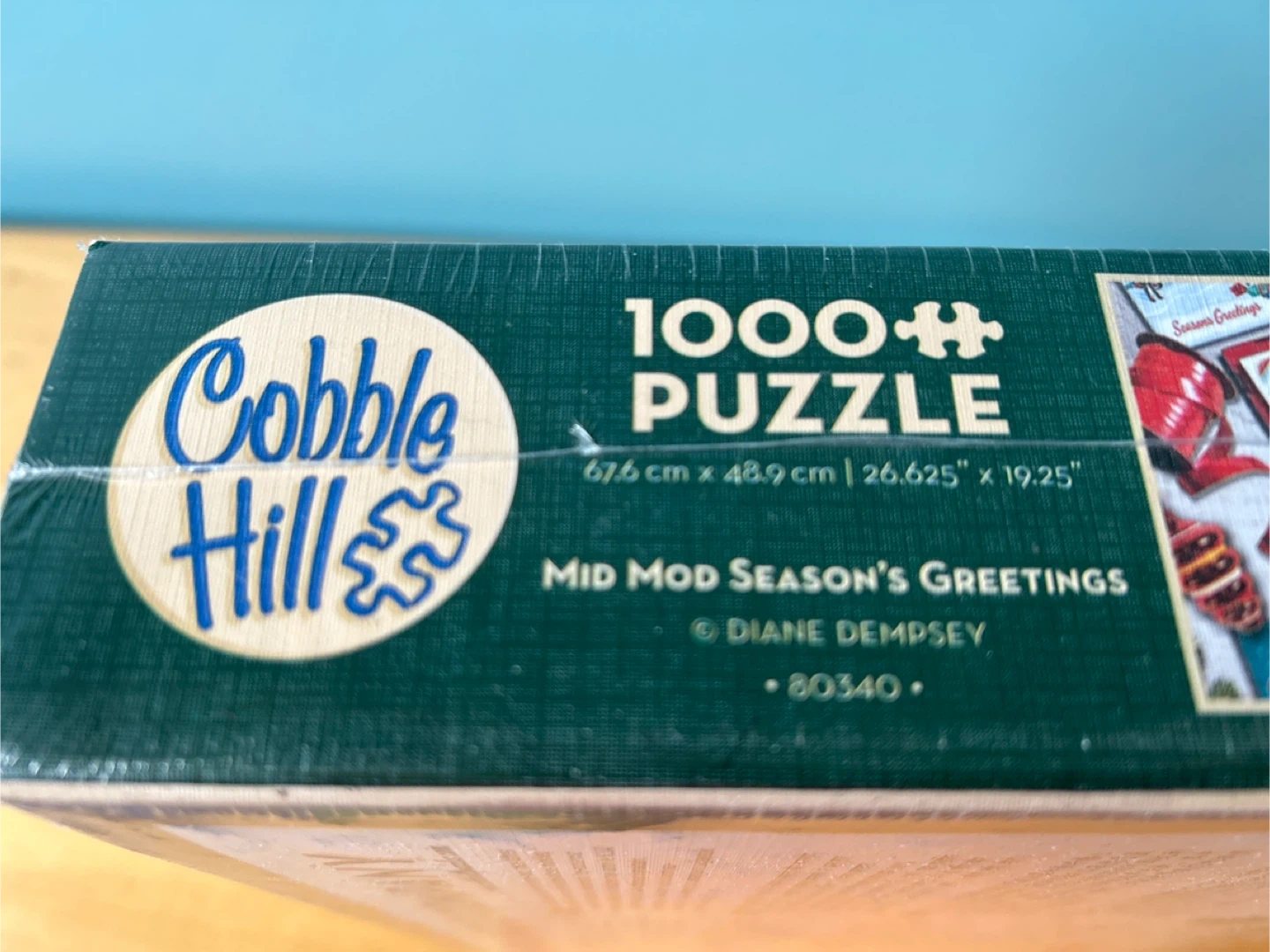 This is a 1000-piece puzzle from Cobble Hill, featuring the "Mid Mod Season's Greetings" design by Diane Dempsey. The puzzle dimensions are 26.625" x 19.25". It's a random cut puzzle.