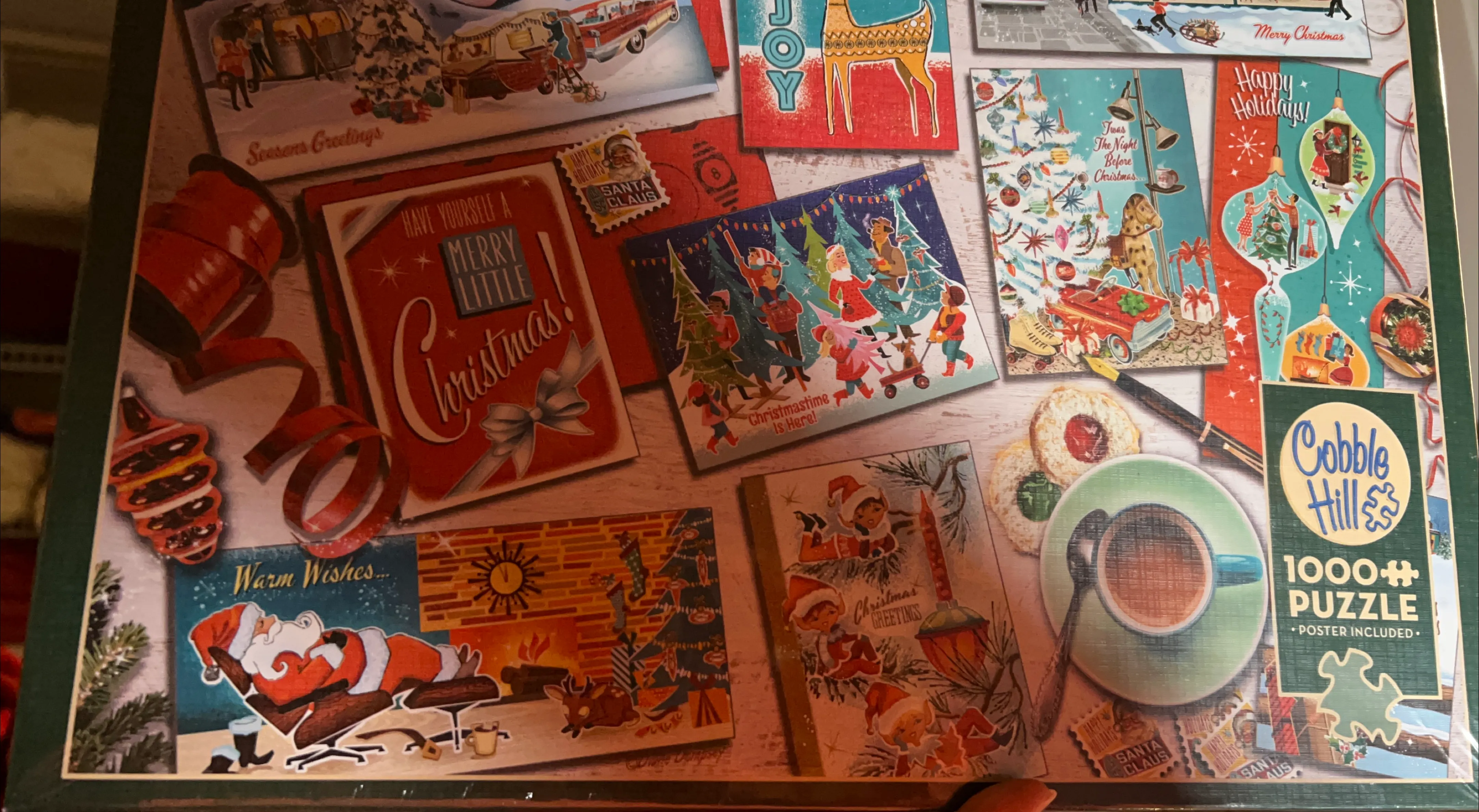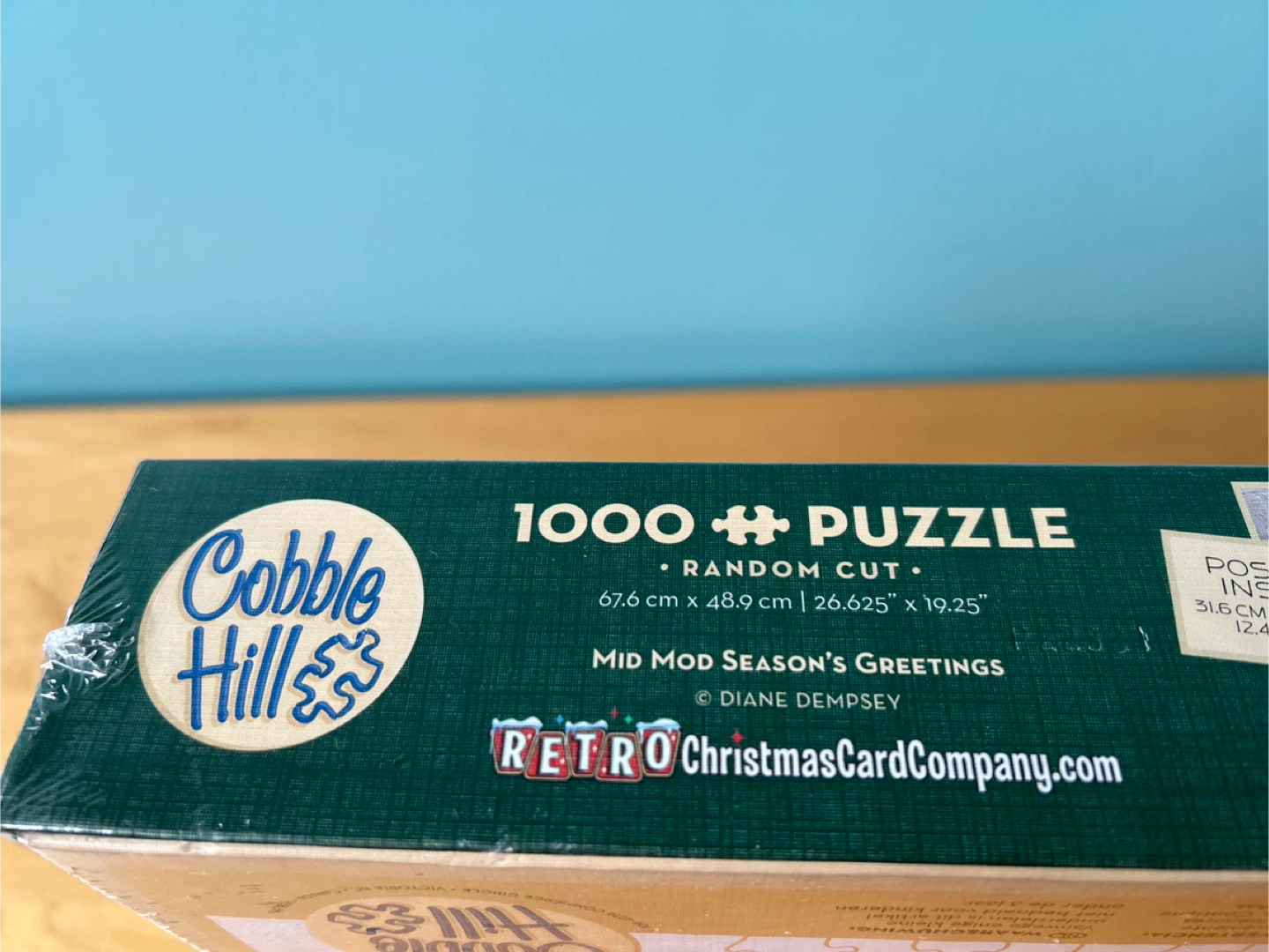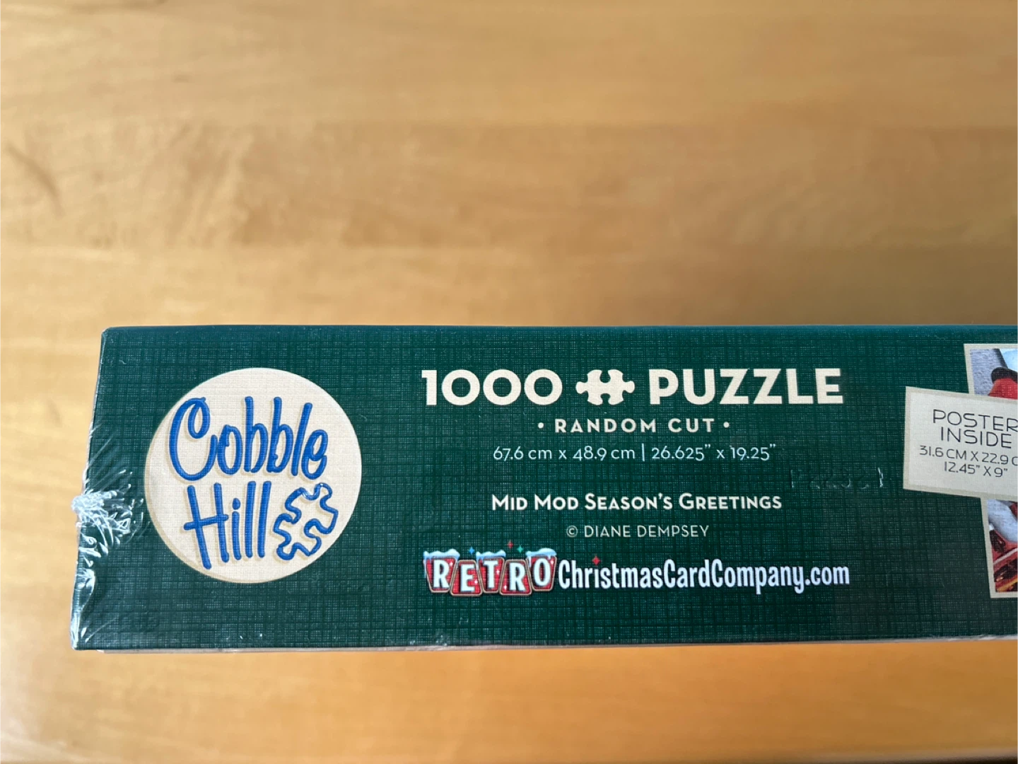 This is a 1000-piece puzzle from Cobble Hill, featuring the "Mid Mod Season's Greetings" design by Diane Dempsey. The puzzle dimensions are 26.625" x 19.25". It's a random cut puzzle.
