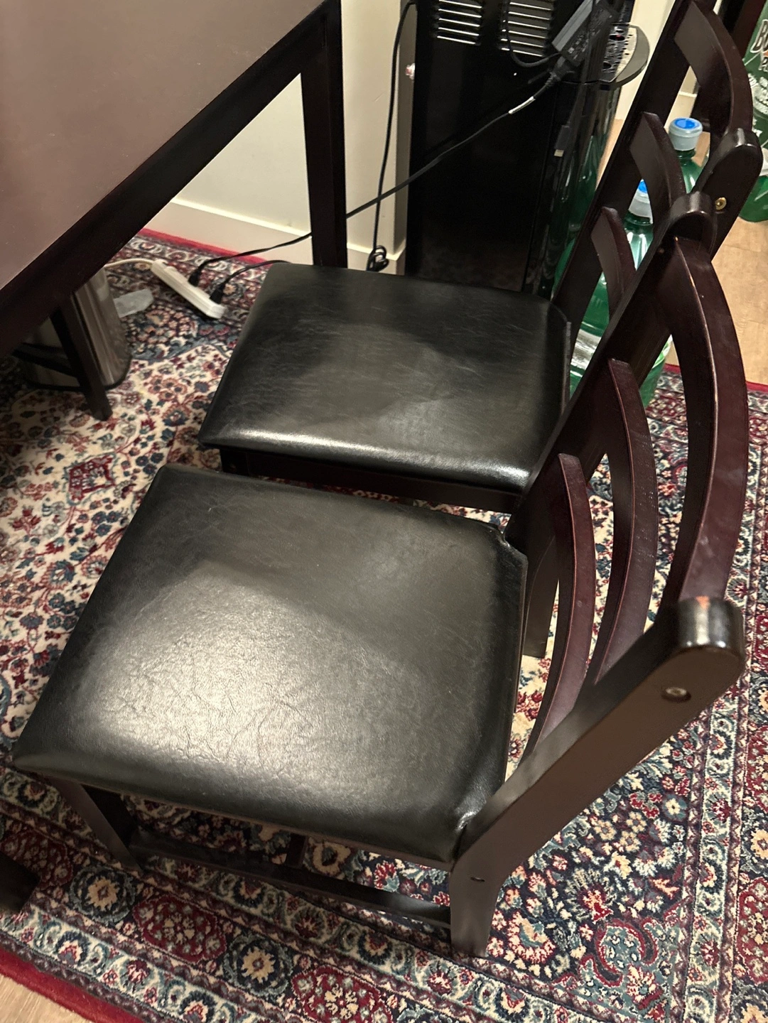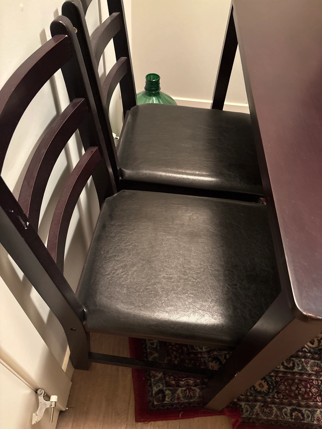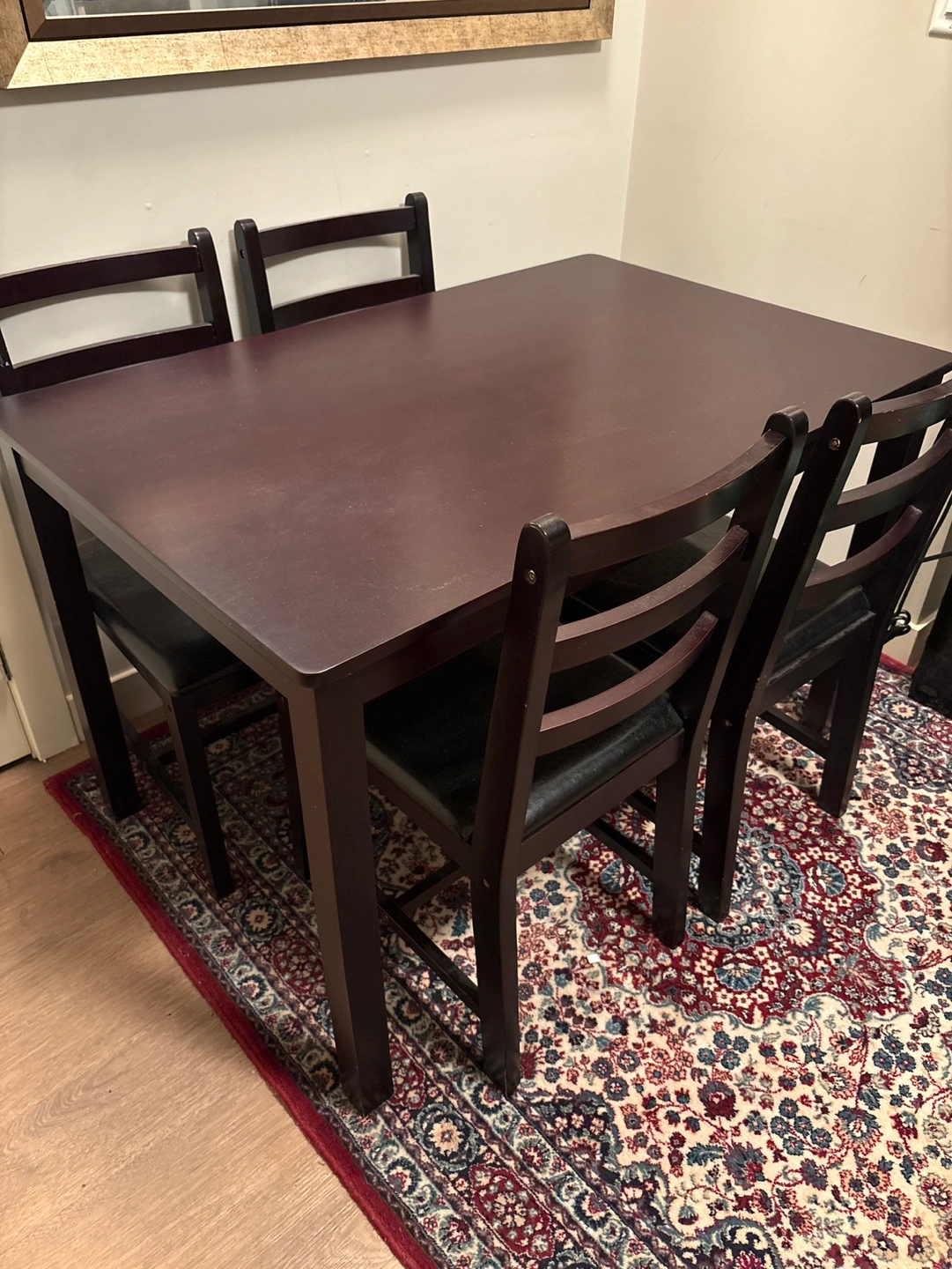 Four-chair dining set. Dark brown wood finish. Black faux leather chair seats. Square table. Good for small spaces.