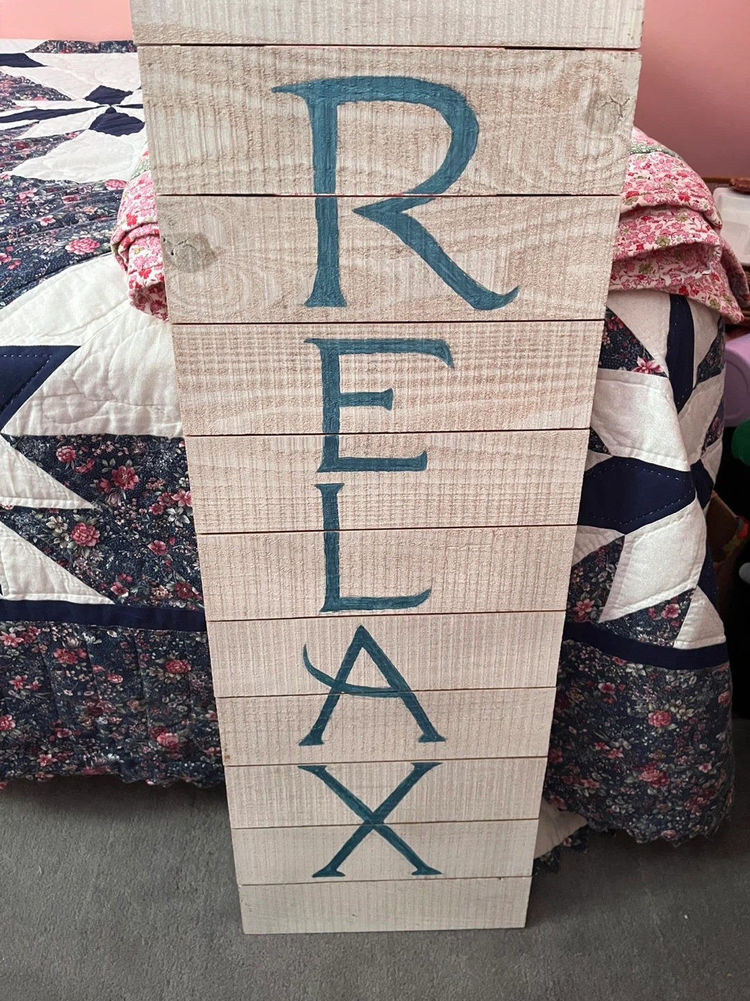 This is a wooden sign with the word "RELAX" painted in teal blue letters. It's made of distressed white-washed wood planks. It adds a cozy touch to any room!