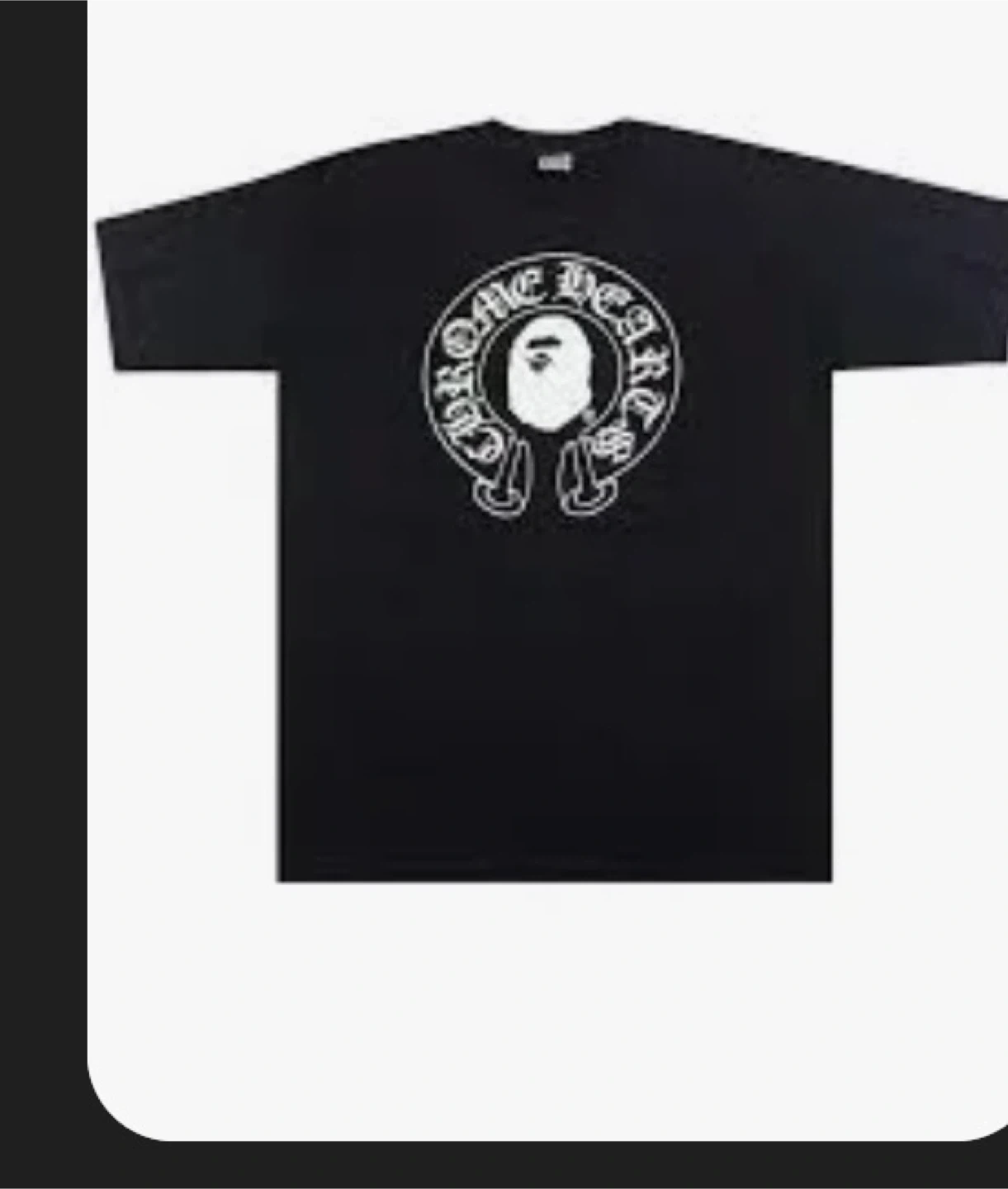 This is a black t-shirt featuring a collaboration between Chrome Hearts and Bape. It has a crew neck and short sleeves.