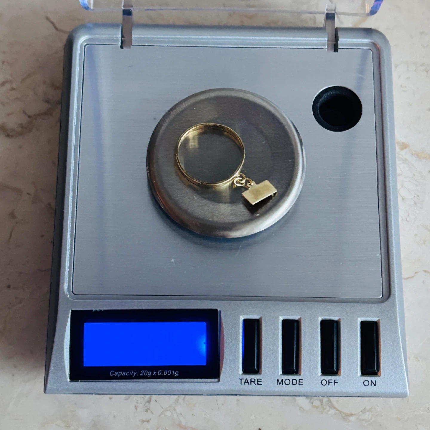 Selling a yellow gold ring with a rectangular charm. It's in great condition and would make a lovely addition to your jewellery collection! Stamped / hallmarked. 1.106g. Size 5 but can be adjusted