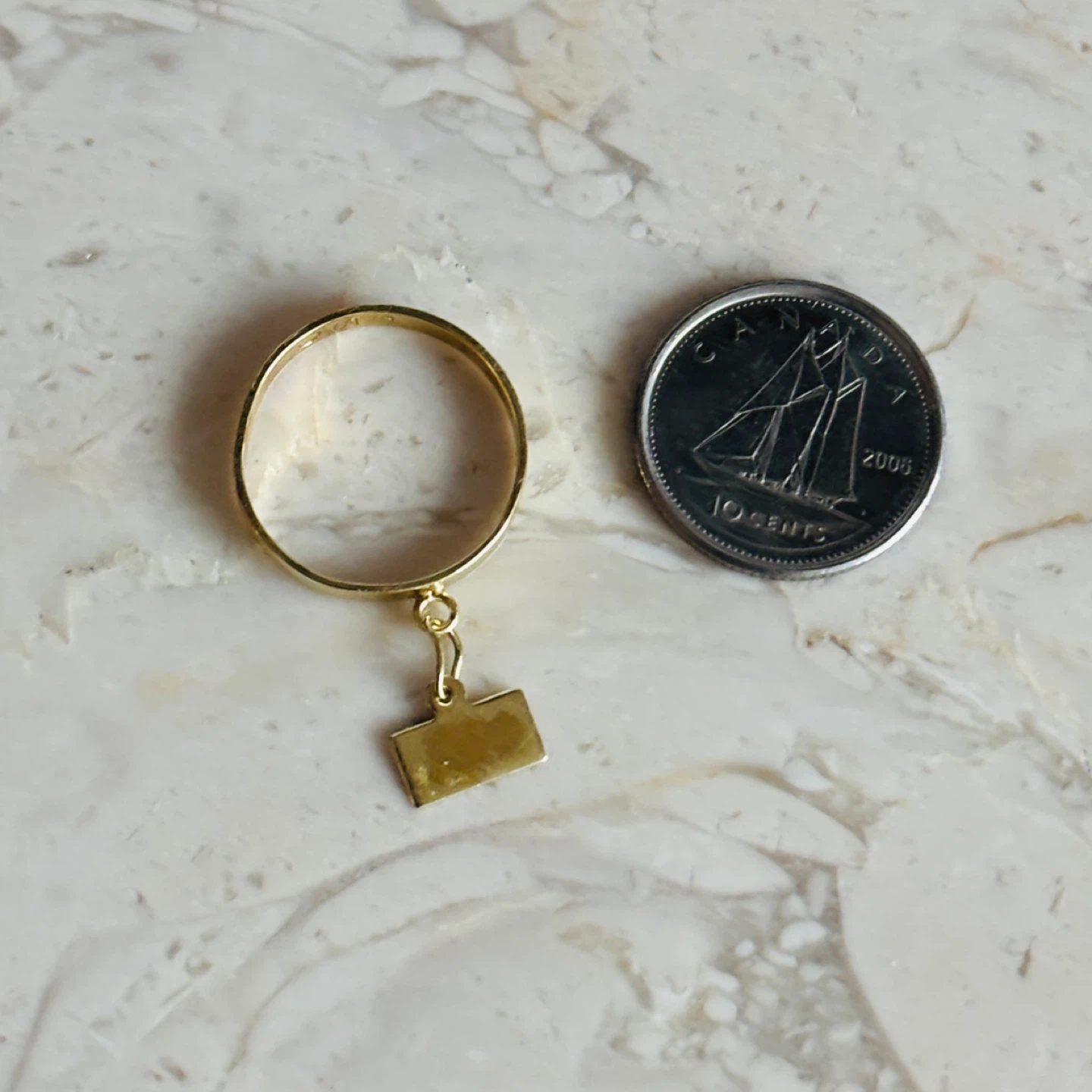 Selling a yellow gold ring with a rectangular charm. It's in great condition and would make a lovely addition to your jewellery collection! Stamped / hallmarked. 1.106g. Size 5 but can be adjusted