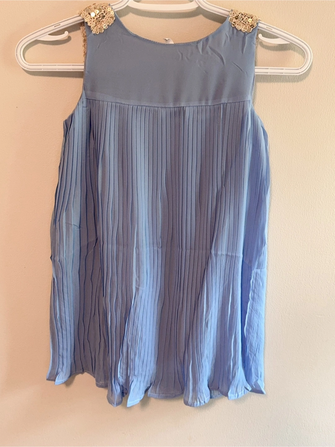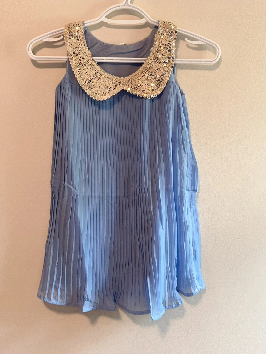 A dress featuring a round neckline. Details include a pleated skirt and a delicate sequin collar.