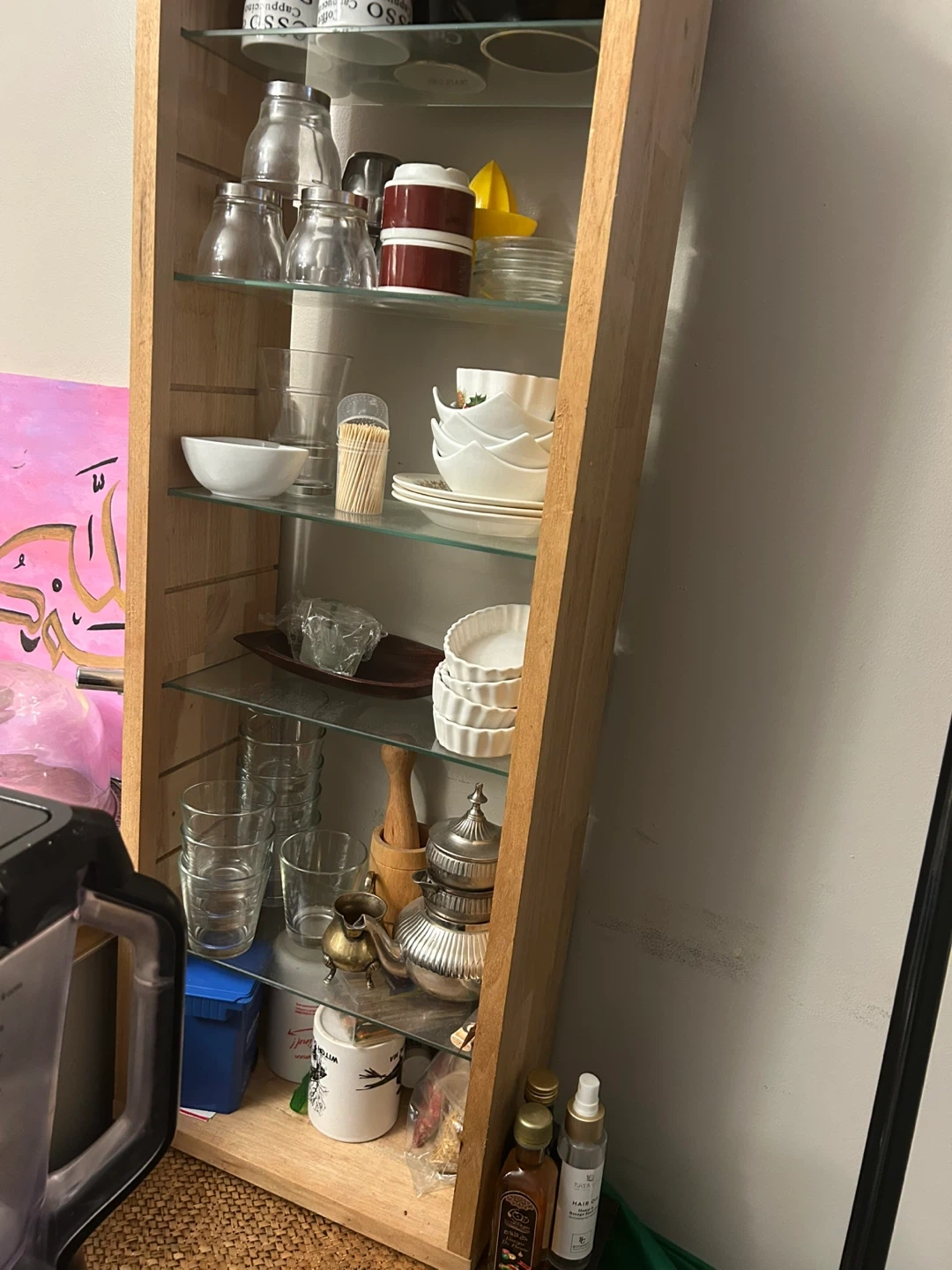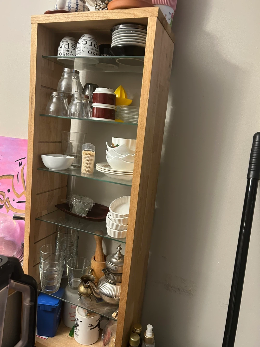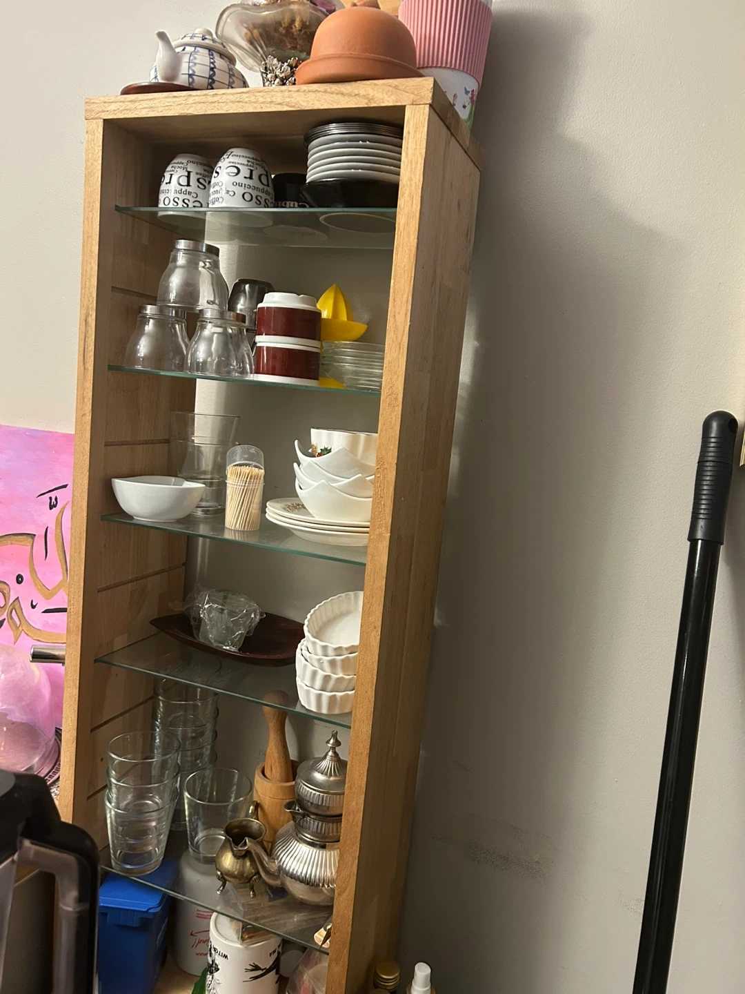 This wooden display cabinet features multiple glass shelves, perfect for showcasing kitchenware or decorative items. It includes a variety of glassware, bowls, plates, and serving pieces.