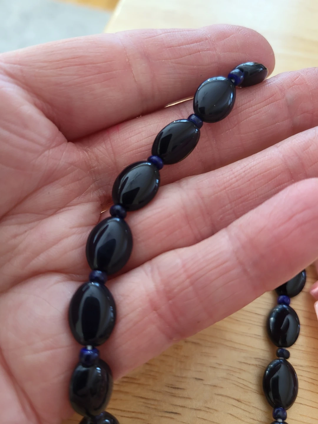 Includes one dark blue oval glass necklace, one pink irregular stone necklace, one black faceted glass necklace, and one multi-coloured faceted bead necklace. Various bead materials and sizes.