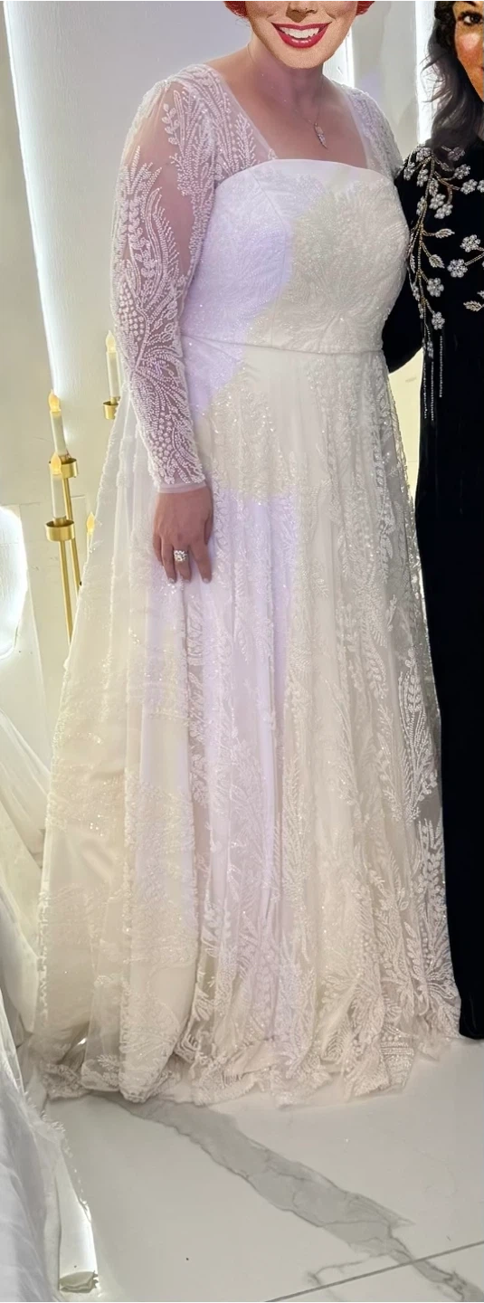 This is a beautiful white wedding dress with long sleeves. It features intricate detailing and a classic design. Perfect for your special day!