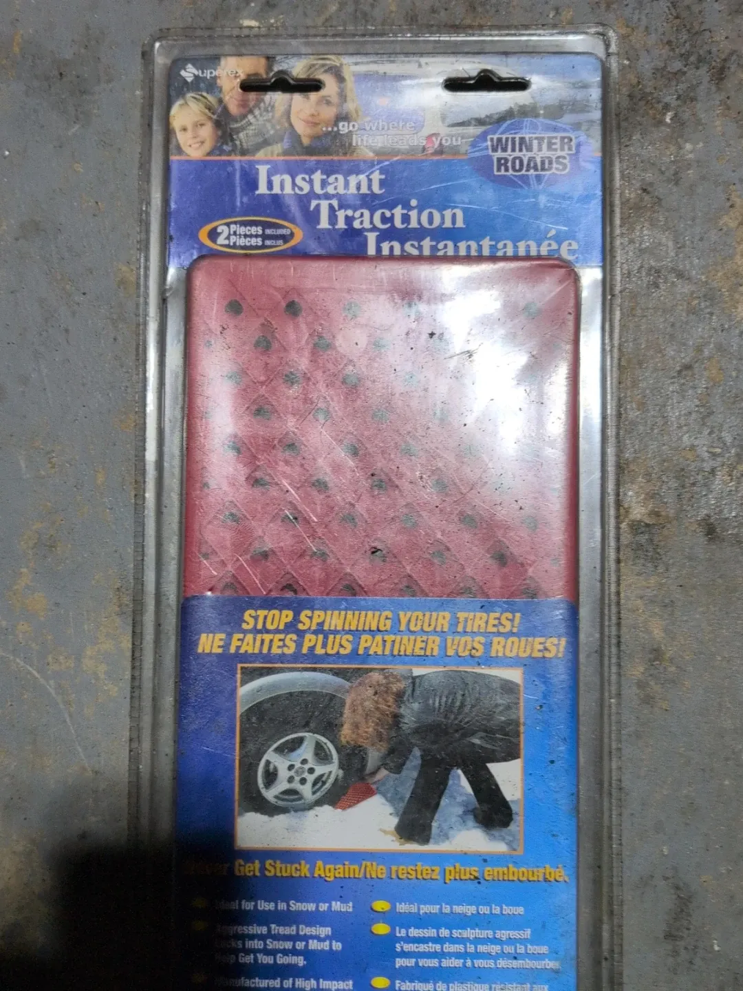 This package includes 2 pieces of Instant Traction mats for your vehicle. They are designed for use in snow or mud to help you get going. Aggressive tread design locks into snow or mud to help you get going.