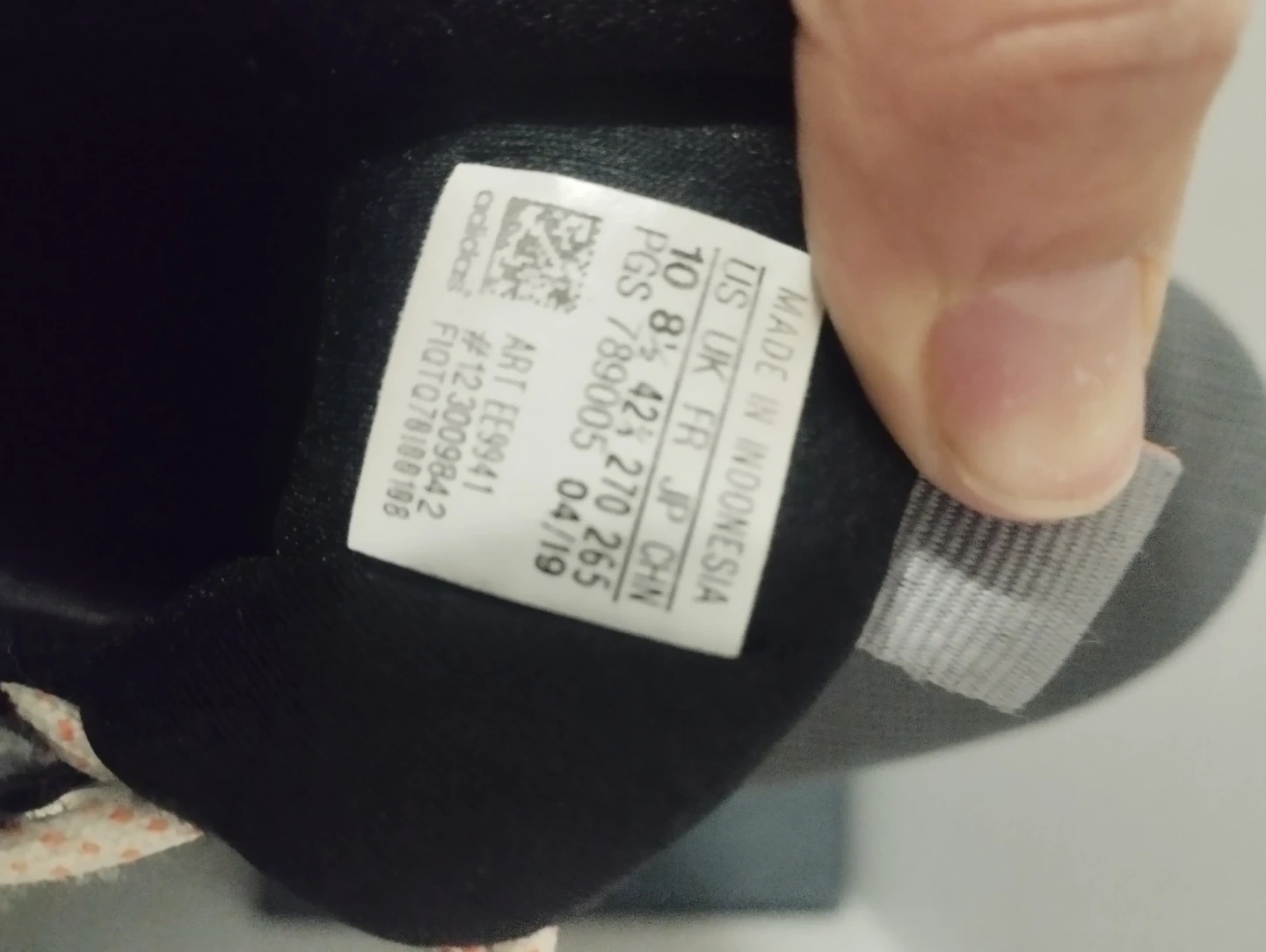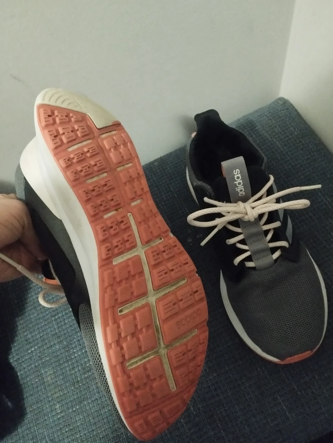 These are Adidas running shoes in a grey, black, and coral colourway. Made in Indonesia. The size is US 10 Perfect for your next run!