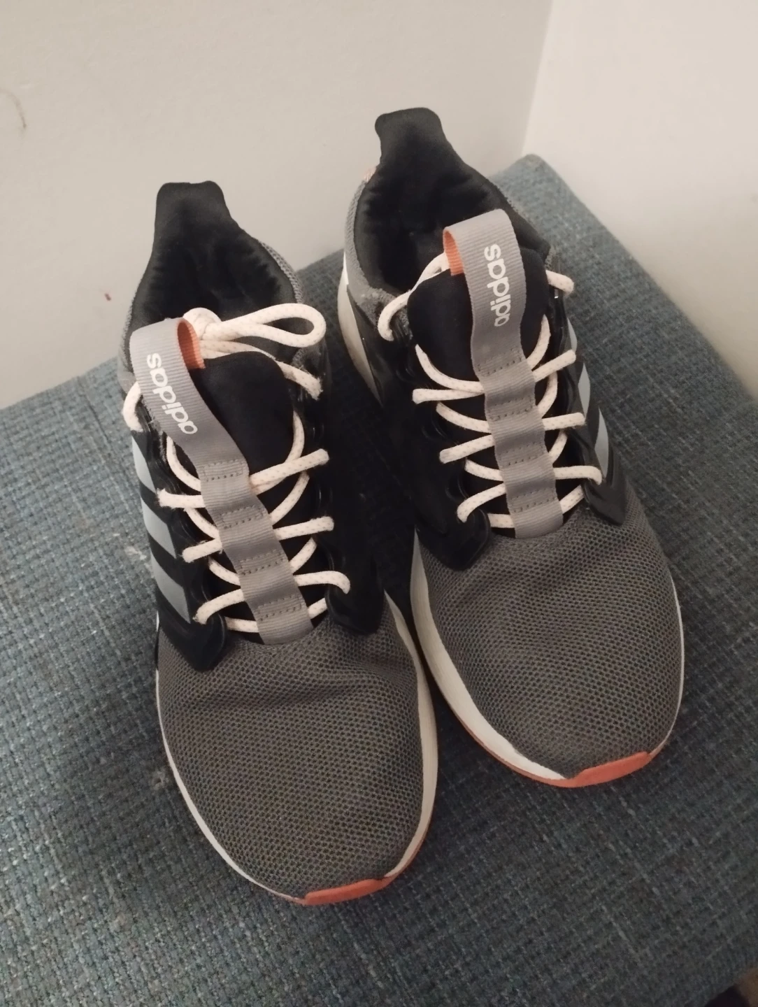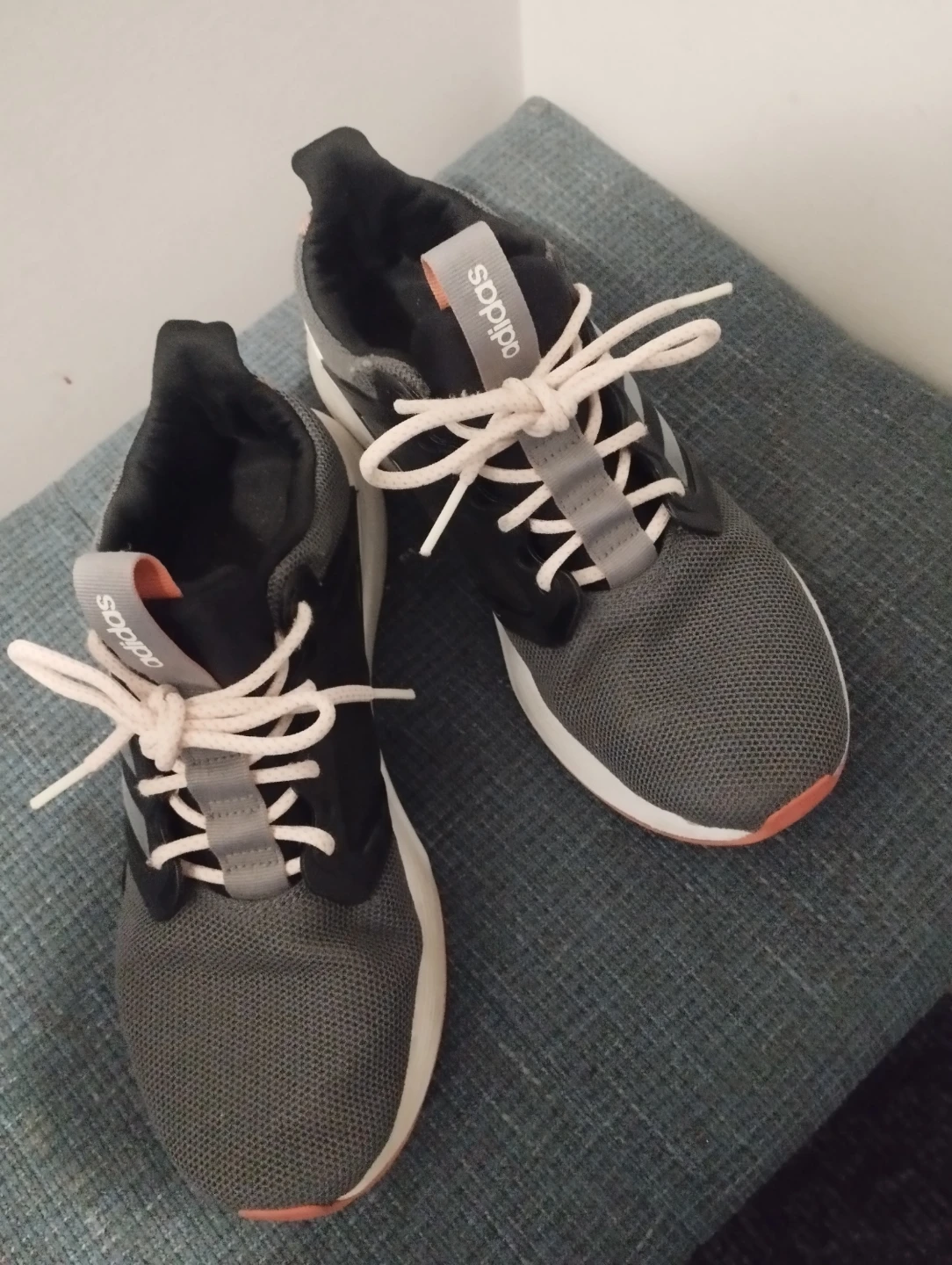 These are Adidas running shoes in a grey, black, and coral colourway. Made in Indonesia. The size is US 10 Perfect for your next run!
