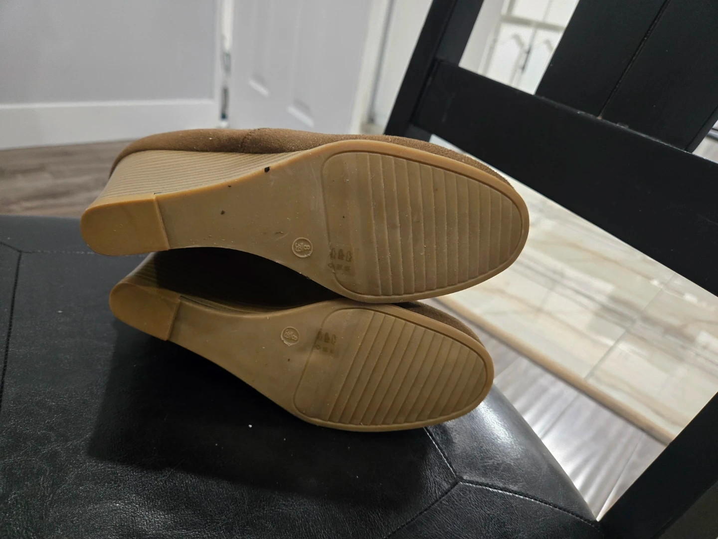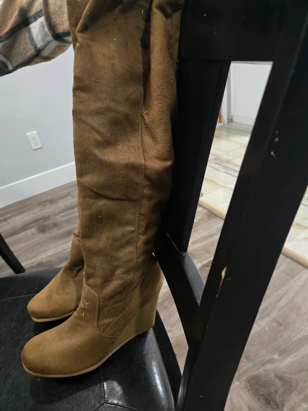 Brown suede over-the-knee wedge boots. Features a stacked wedge heel and button detailing at the calf. Perfect for keeping warm during cooler weather!