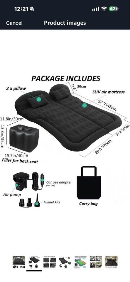 Includes inflatable SUV mattress, electric air pump, inflatable pillows, and carry/storage bags. Fits most SUVs, made with durable, leak-resistant material. Fast inflation/deflation and compact for easy storage. Used only once for a trip. Selling because I don't need it anymore.
