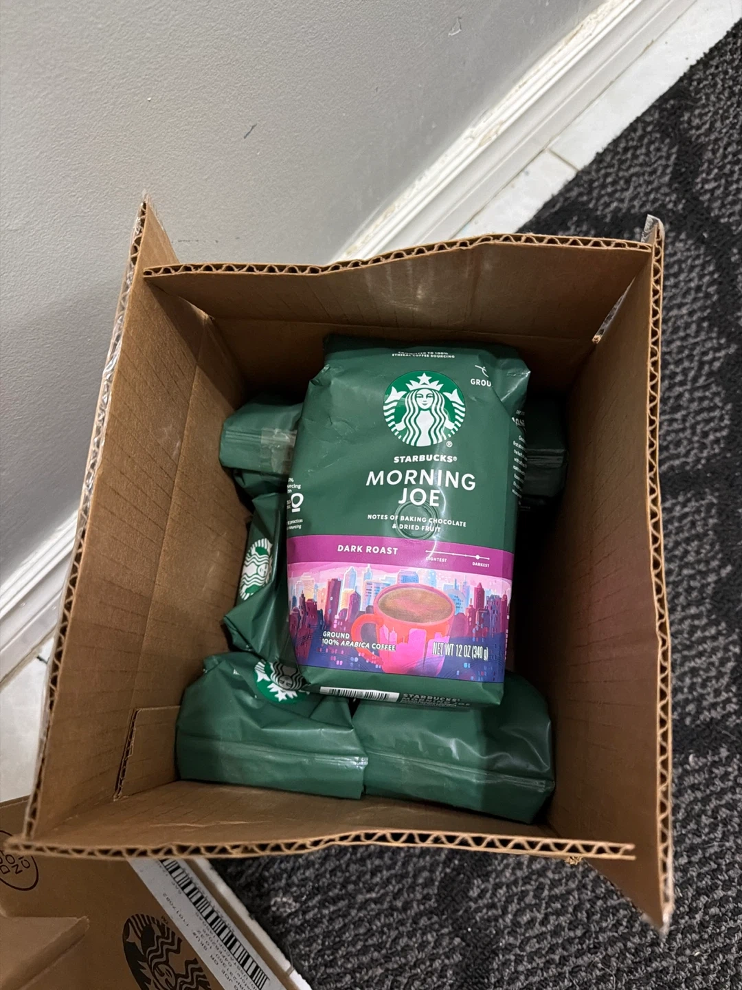 This is a 6-pack of Starbucks Morning Joe dark roast coffee. Each bag contains 100% Arabica coffee with notes of chocolate and dried fruit. Each bag is 12 oz.