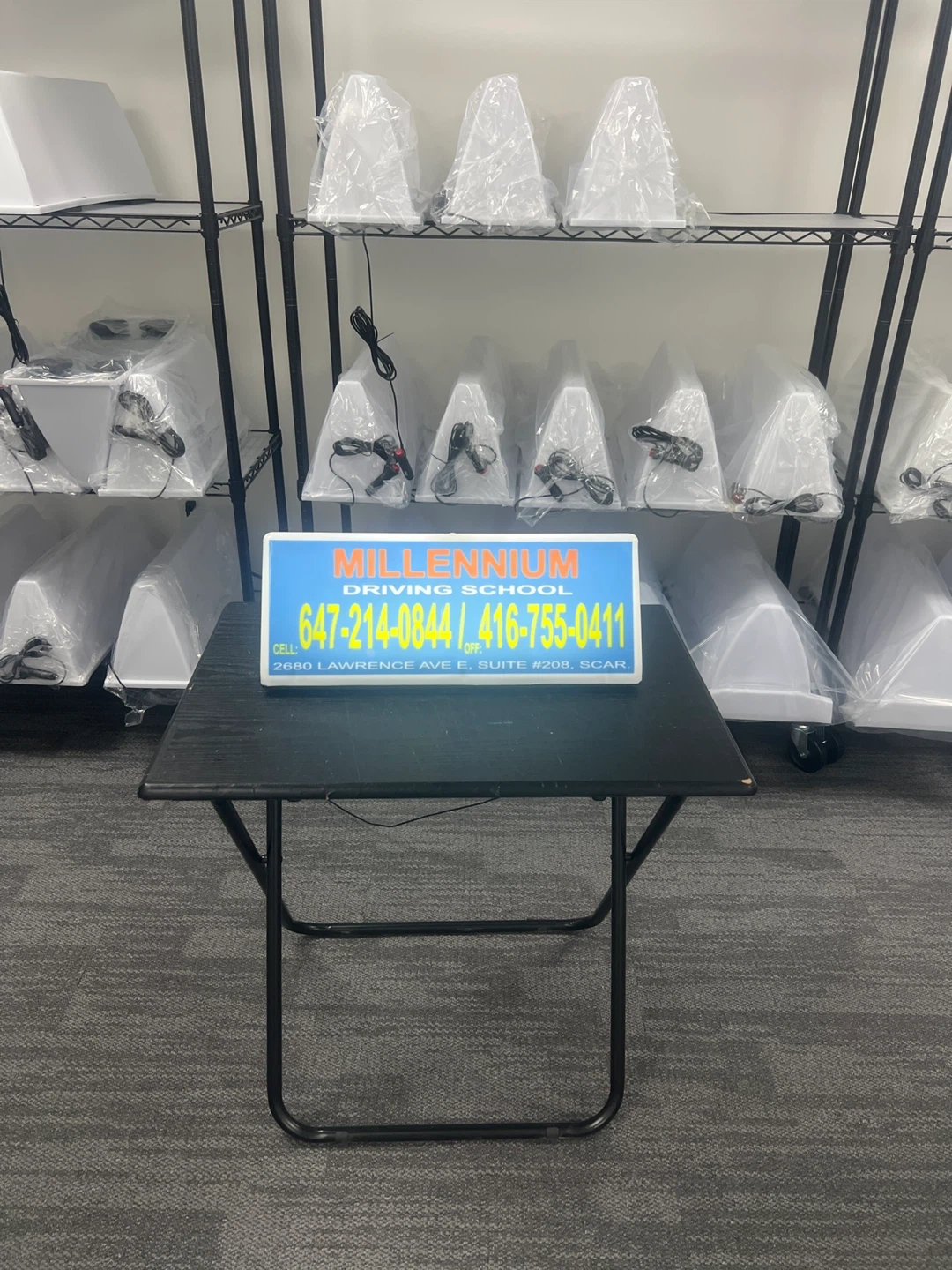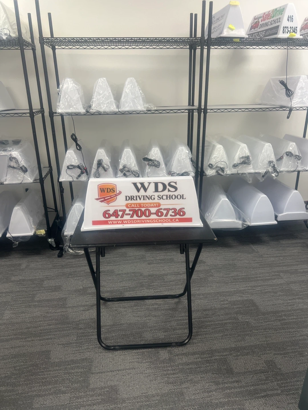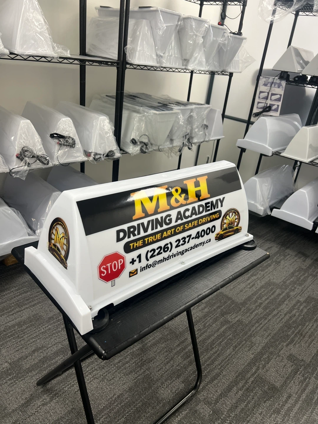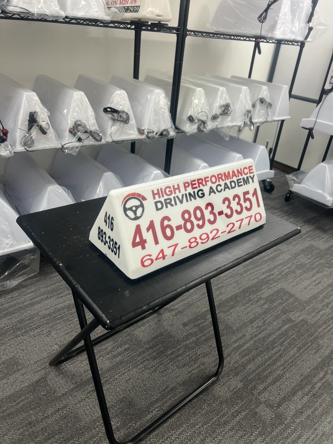 This is a roof sign board for a driving school advertising . It displays a phone number and the academy's name. It's designed to be visible for advertising purposes. Great for use on a vehicle or at a business location!