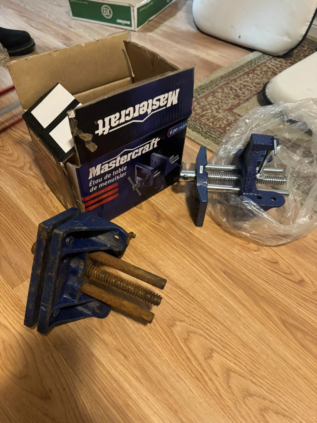 This Mastercraft table vise is 6 inches (15.2 cm) wide. It's made for woodworking. Includes original box and packaging. It's blue in colour.