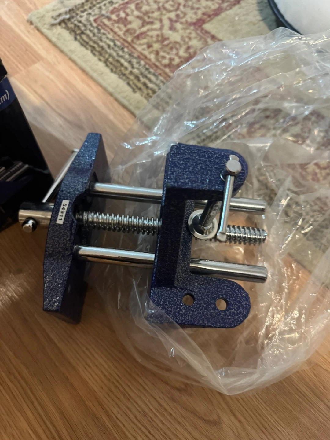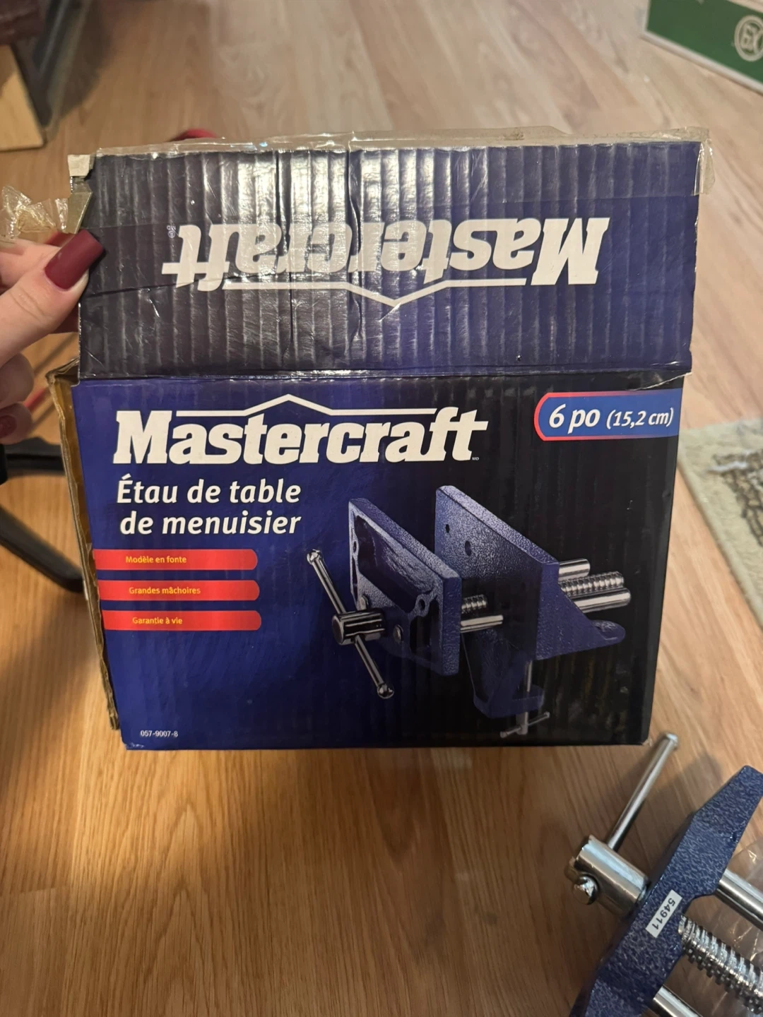 This Mastercraft table vise is 6 inches (15.2 cm) wide. It's made for woodworking. Includes original box and packaging. It's blue in colour.