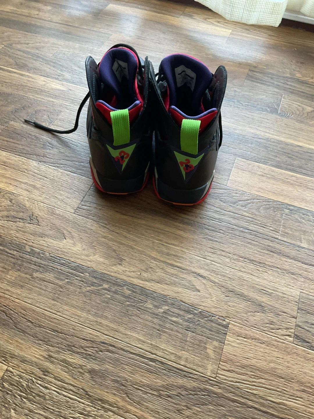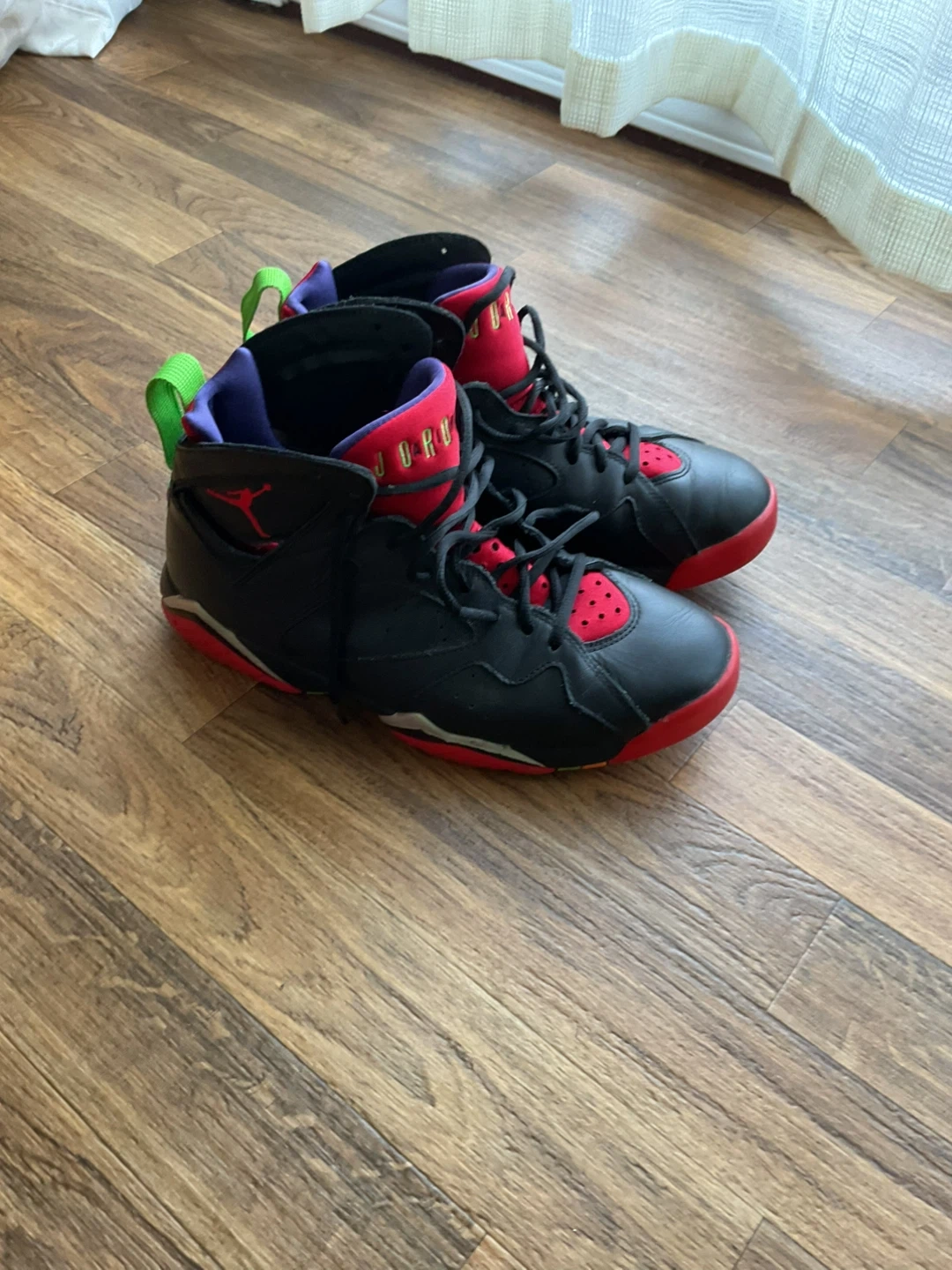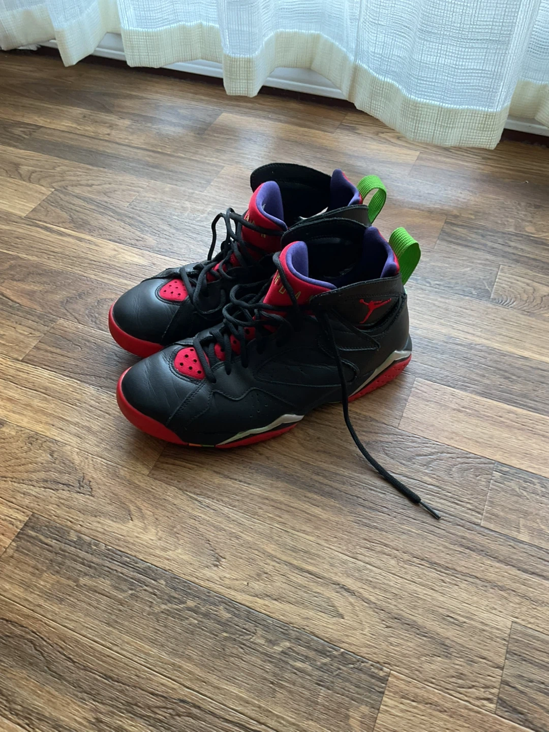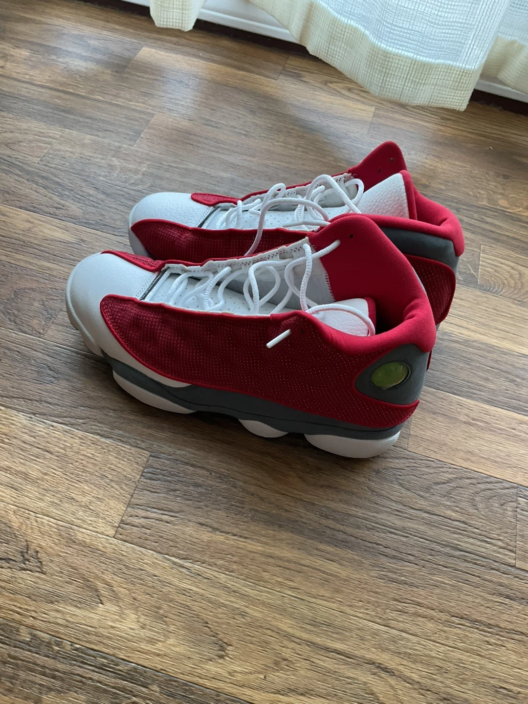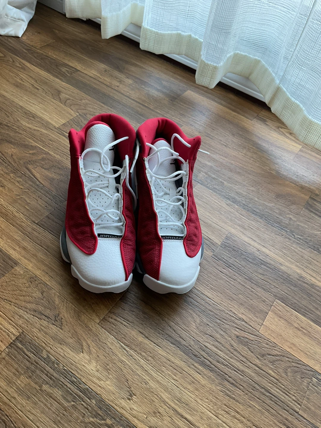 These are Air Jordan 13 Retro sneakers in a red and white colourway. They feature a leather and textile upper with a rubber sole. A classic sneaker design for any collection. Jordan 7 Mars is free.