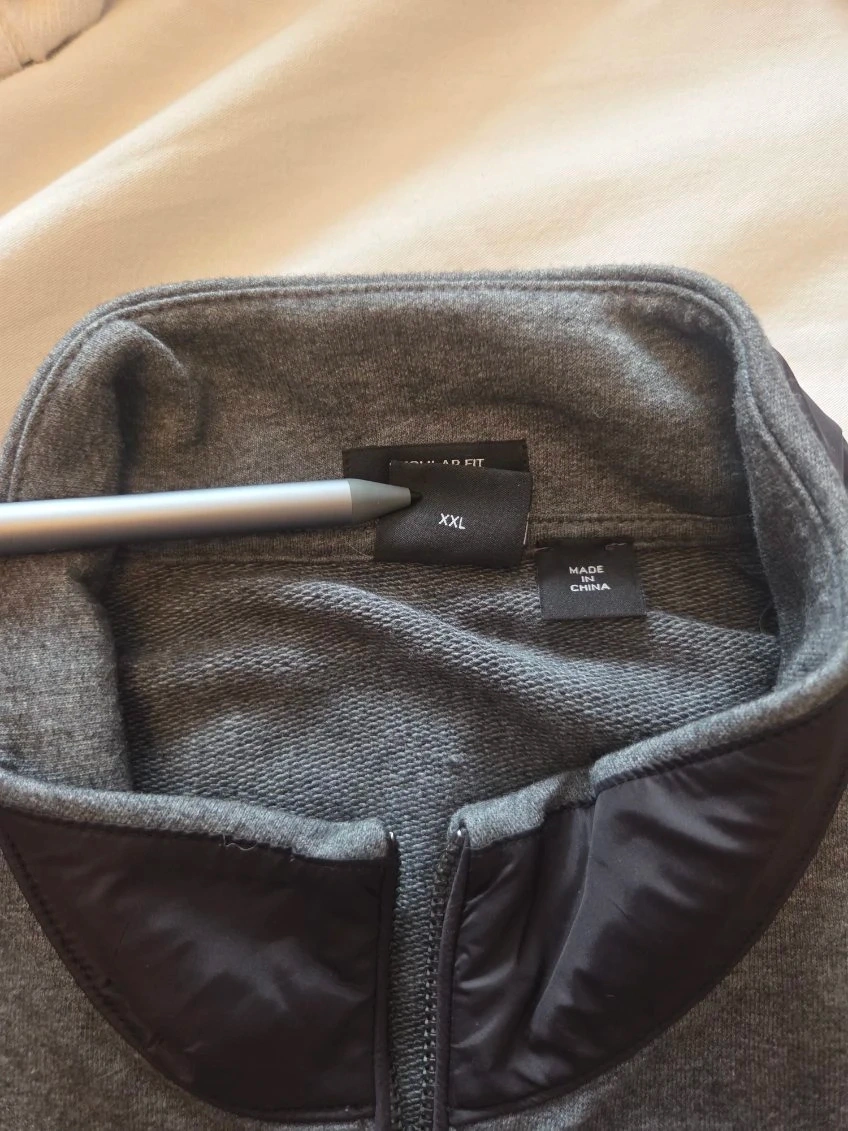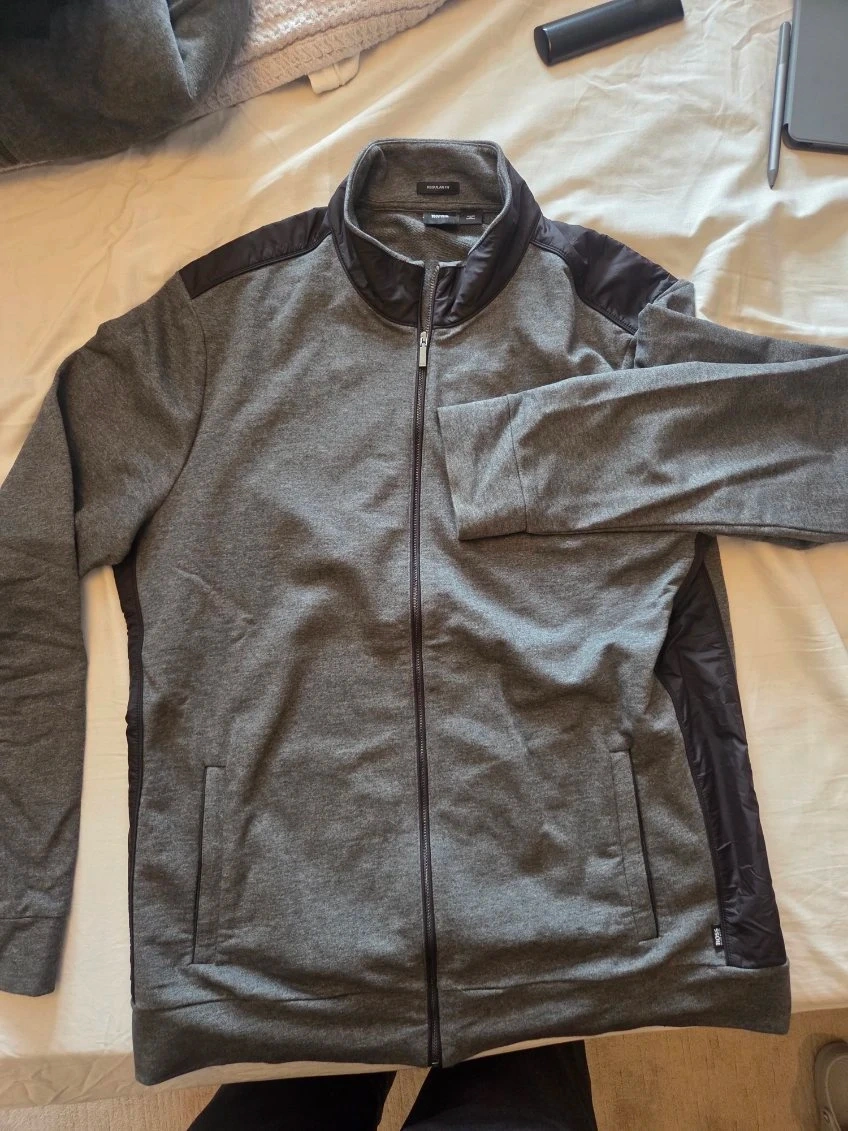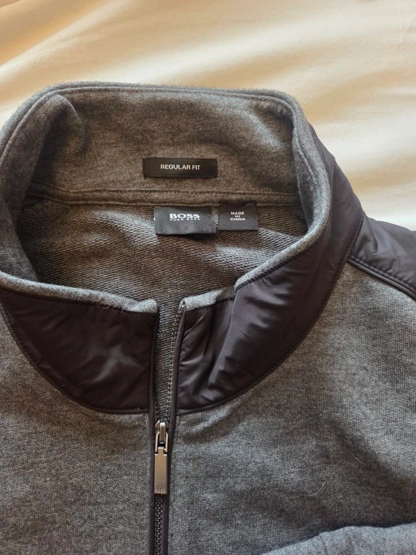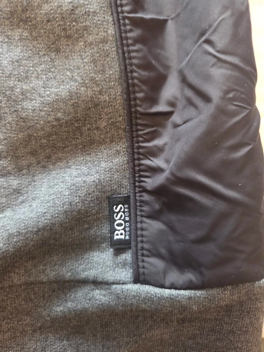 BOSS Hugo Boss full zip jacket in grey. It's a regular fit with contrasting black puffer panels on the shoulders and sides. Made in China. Size XXL.