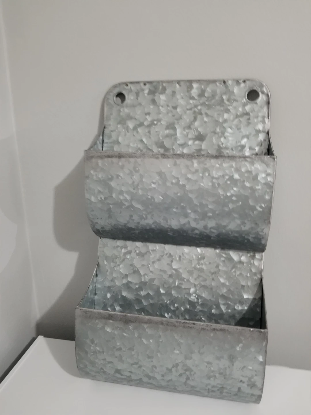 A three-tiered galvanized metal wall organizer for letters or mail. It's made of sturdy metal with a distressed finish. This organizer is handy for keeping mail and small items tidy by the door.