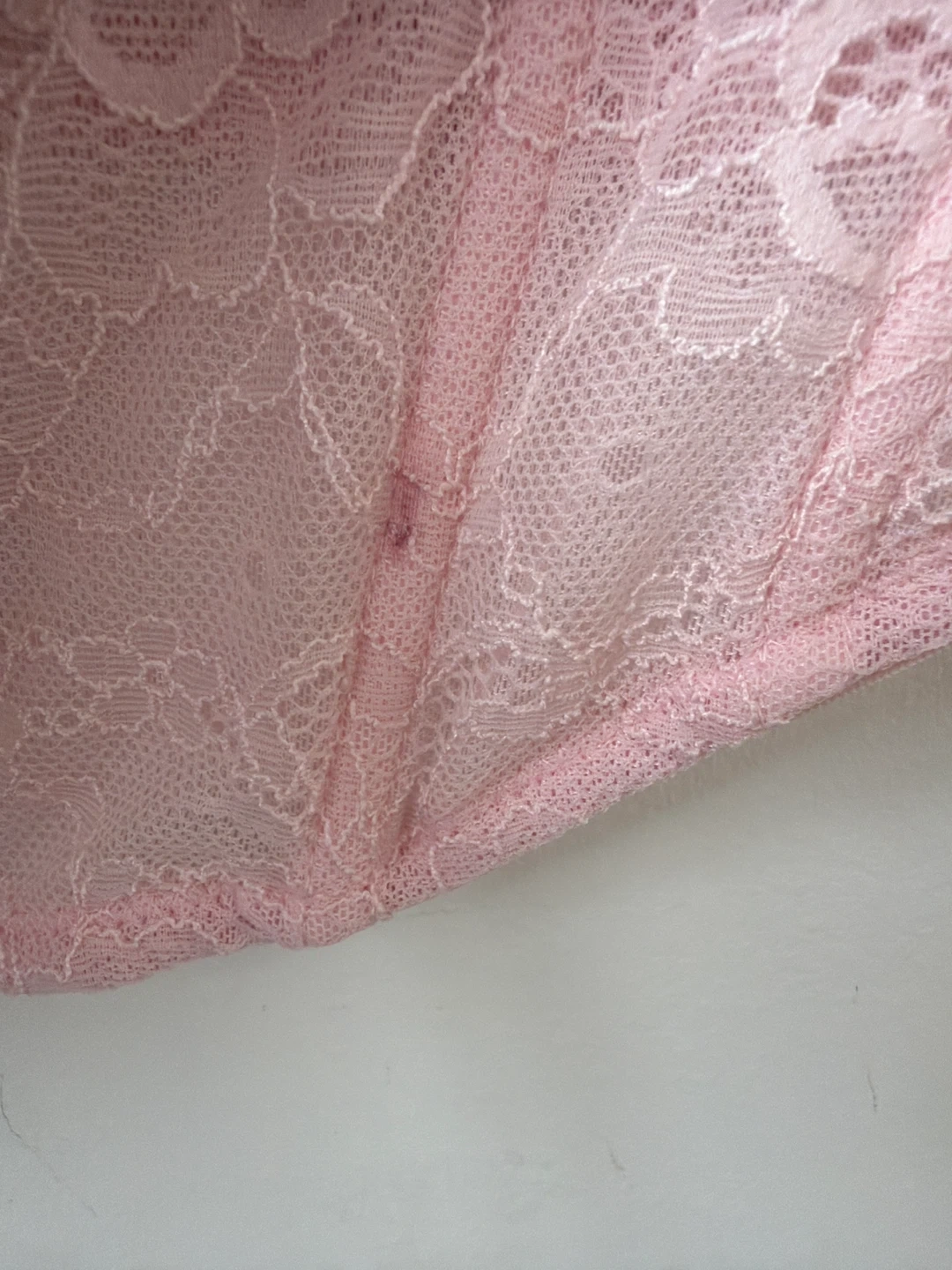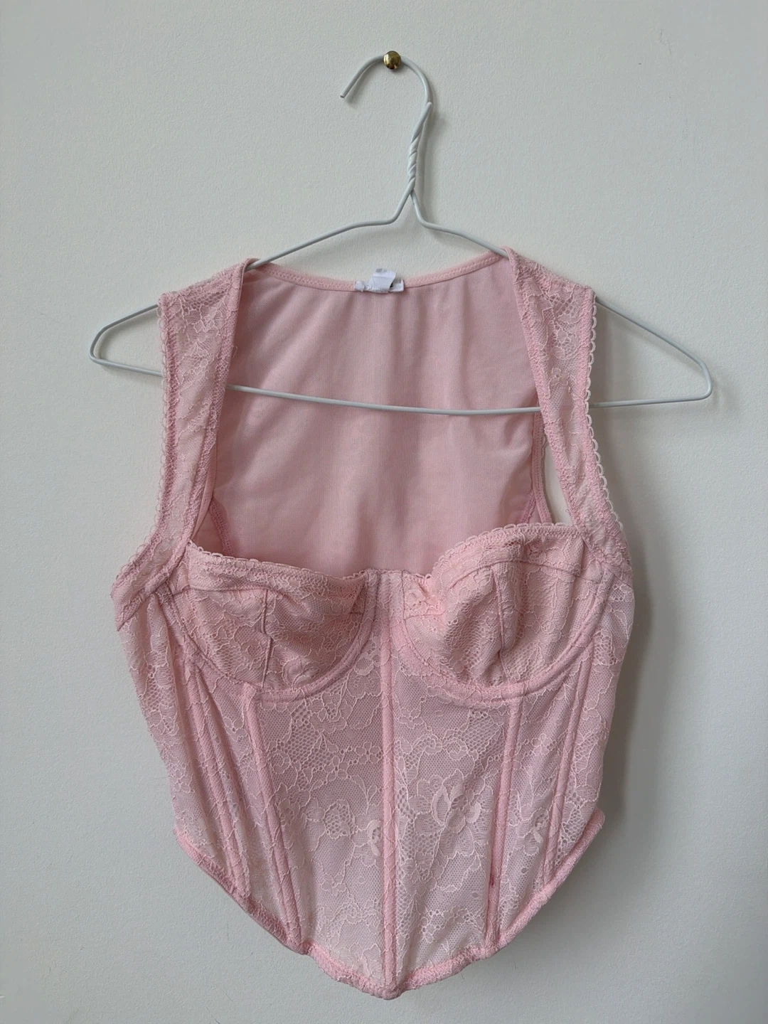 This is a pink lace corset top from Garage. It's a size P/S. It has a zippered closure on the side. been worn once! but does have a light cosmetic blemish but very faint and could probably be removed.