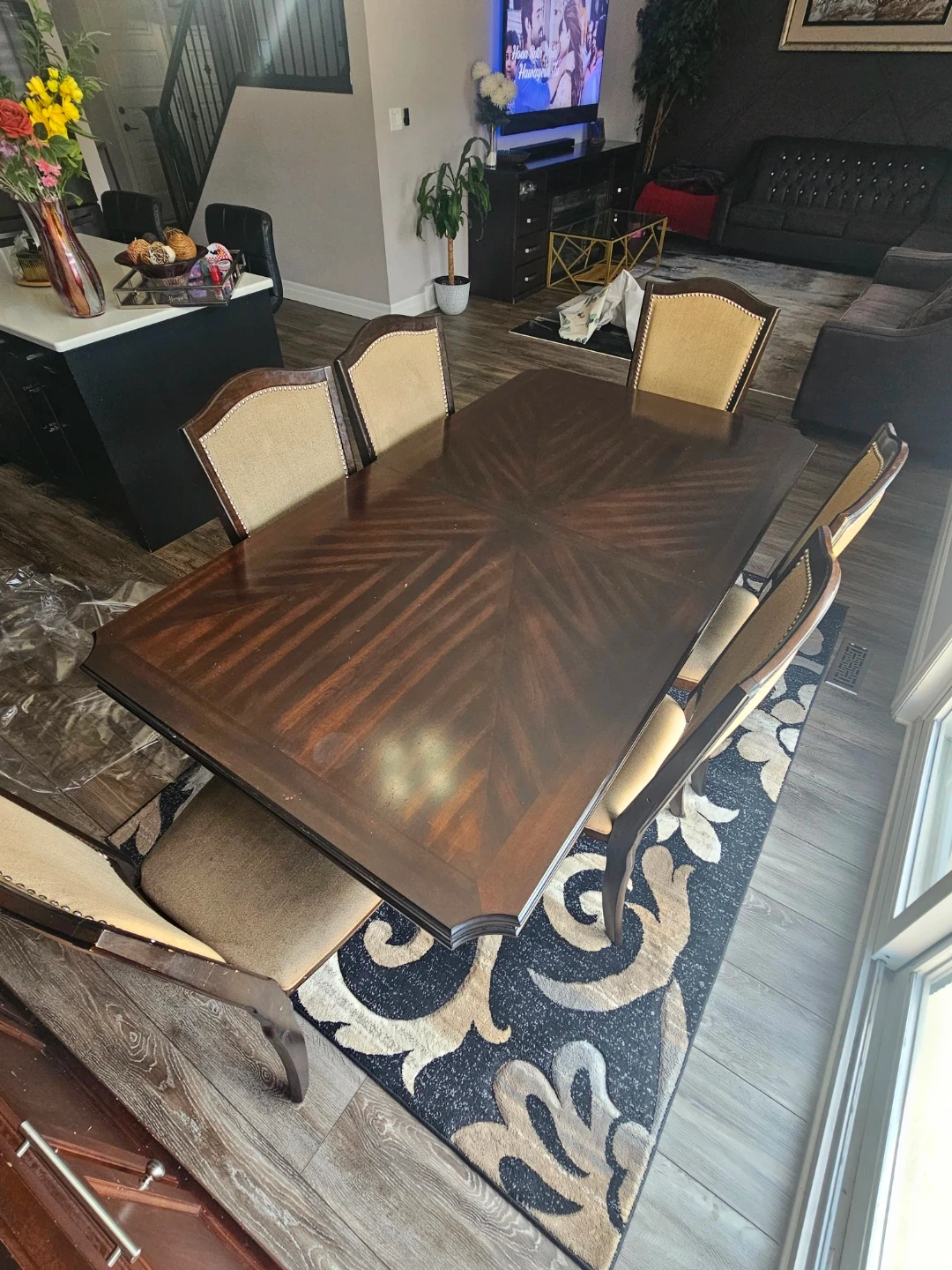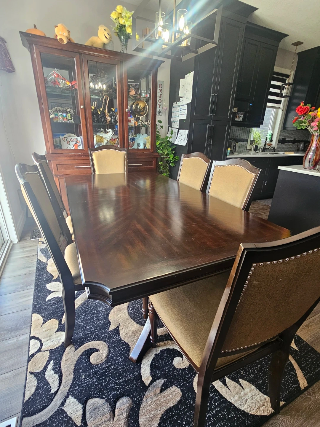 This is a dark wood dining table with a detailed wood grain pattern on the surface. It comes with six upholstered chairs that have nailhead trim. The table and chairs have a classic design.