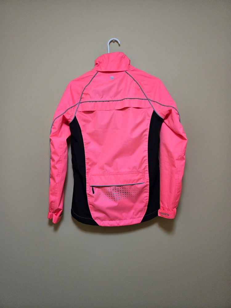 Pink and black women's jacket UK size 6 with a zipper closure and reflective accents. The jacket has multiple pockets.