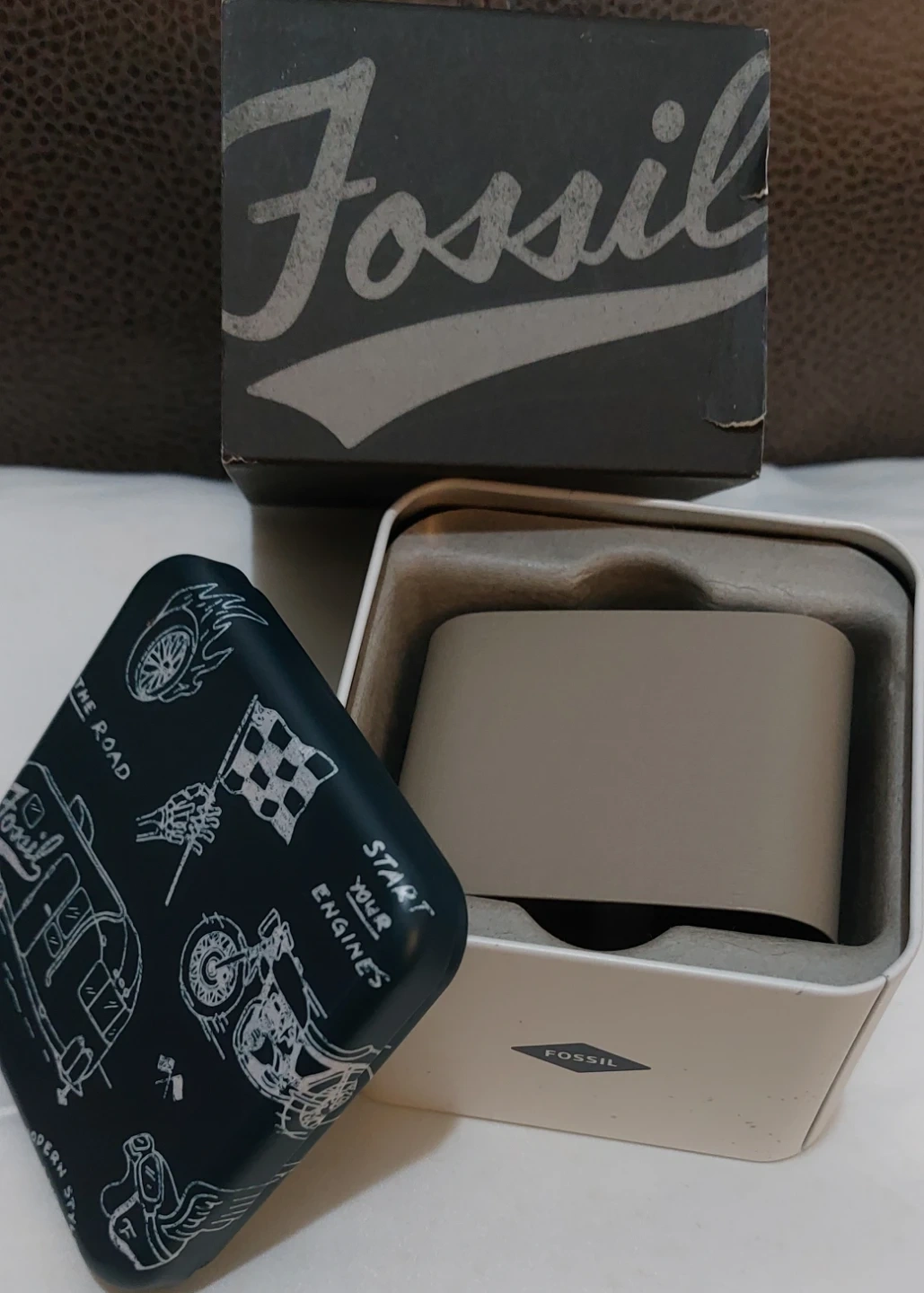 This is a Fossil watch box, including the outer cardboard sleeve and the inner tin case. The tin has a fun, graphic design with a motor racing theme. It's great for storing watches or other small items.