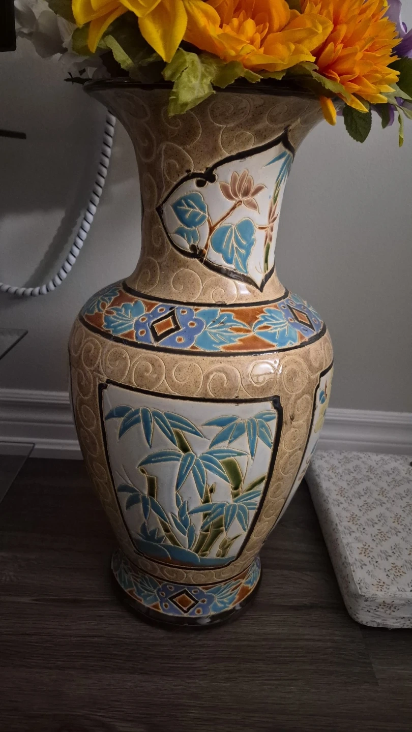 A beautiful decorative ceramic vase featuring a raised design of lotus flowers and bamboo. This piece has a textured tan background with contrasting blue and brown accents. It's perfect for adding a touch of elegance to any room.