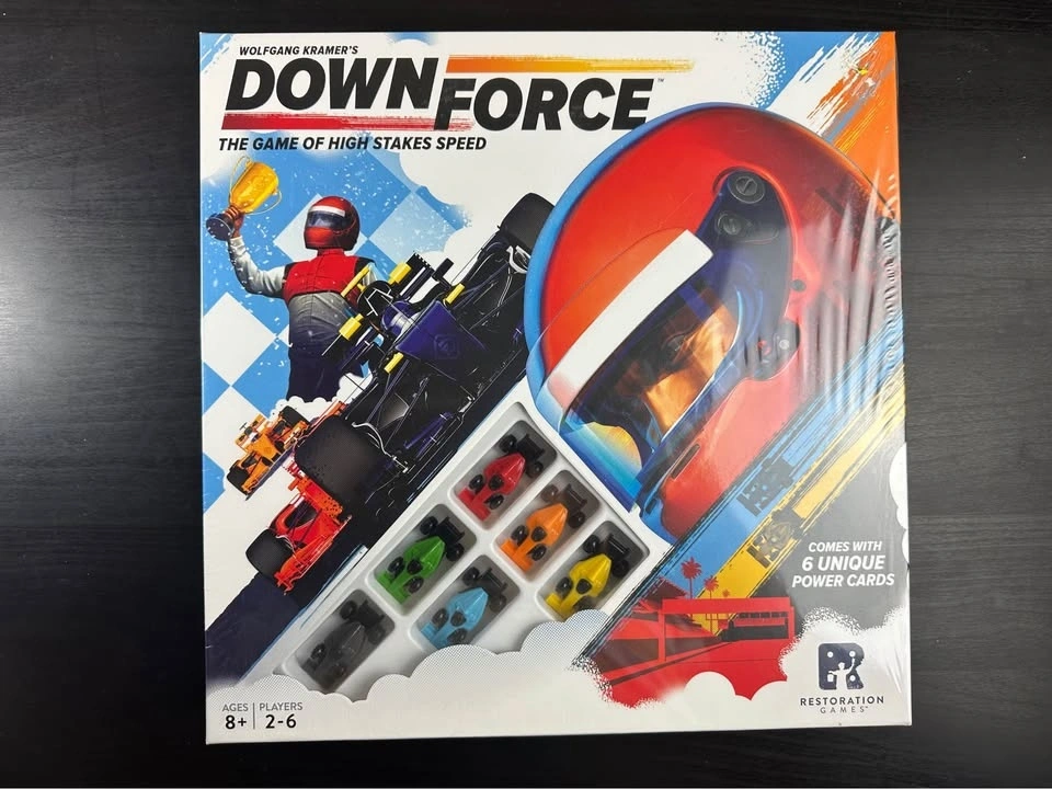 High-stakes bidding on million-dollar race cars. Frantic bets placed in secret even as the cars race around the track. And to the victor, the biggest purse of all. But in the world of motor racing, the margin between victory and defeat can be a single moment: a steep banked turn, tires screaming and spitting out smoke, and the downforce, pressing you down in your seat and keeping you on the track as you make your move inside to pull ahead. Downforce is a card-driven bidding, racing, and betting game for 2-6 players based on Top Race, the award-winning design by the legendary Wolfgang Kramer. Players first bid to own the six cars in the race, then they play cards from their hand to speed them around the track. However, most cards will also move their opponents' cars. So figuring out just the right time to play a card is the key to victory. Along the way, players make secret bets on who they think will win the race. Whoever has the most money from their prize money, winning bets, and remaining bank wins. This is a game whose design needed no attention. Years of play and multiple versions have honed it to near perfection. On the contrary, one of the design challenges was figuring which of the many rules modules to incorporate to create the most fun version. Downforce also adds variable player powers to improve replayability. But mostly, it improves the look of the game to make it gorgeous and easy to play. Special attention was paid to the colors, the layout of the cards, the design of the cars, the details on the board, and more.