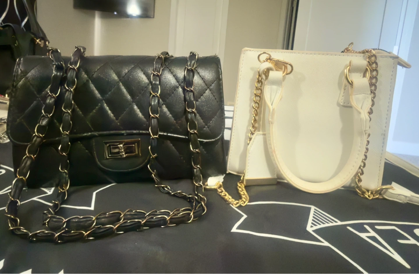 Set includes one black quilted crossbody bag with a gold chain strap and one white top handle purse. Both bags feature a faux leather finish. These bags are great for carrying essentials.