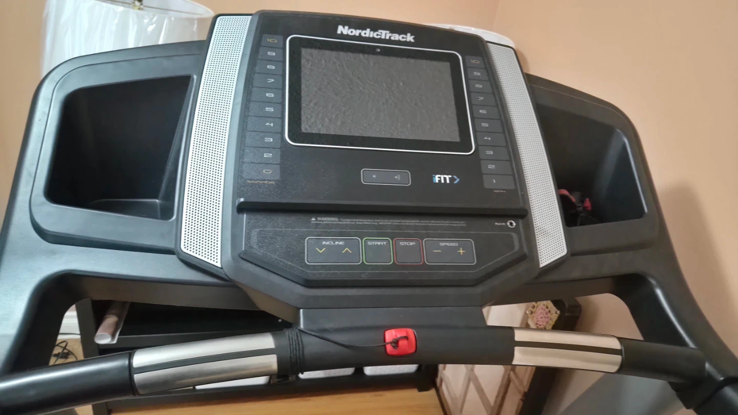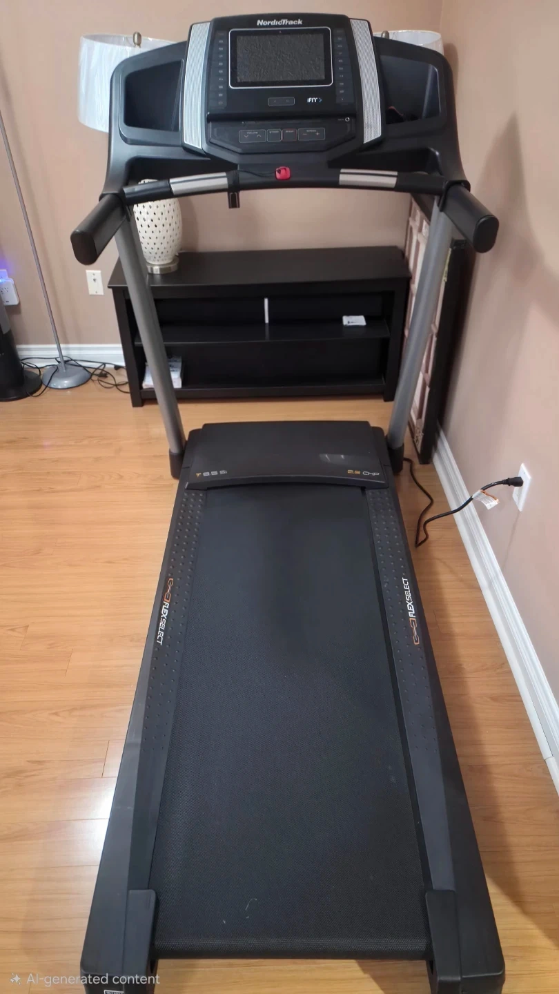 NordicTrack T855 treadmill with FlexSelect deck. It features incline and speed controls. This machine is great for home workouts!