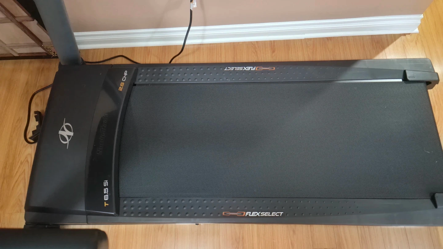 NordicTrack T855 treadmill with FlexSelect deck. It features incline and speed controls. This machine is great for home workouts!