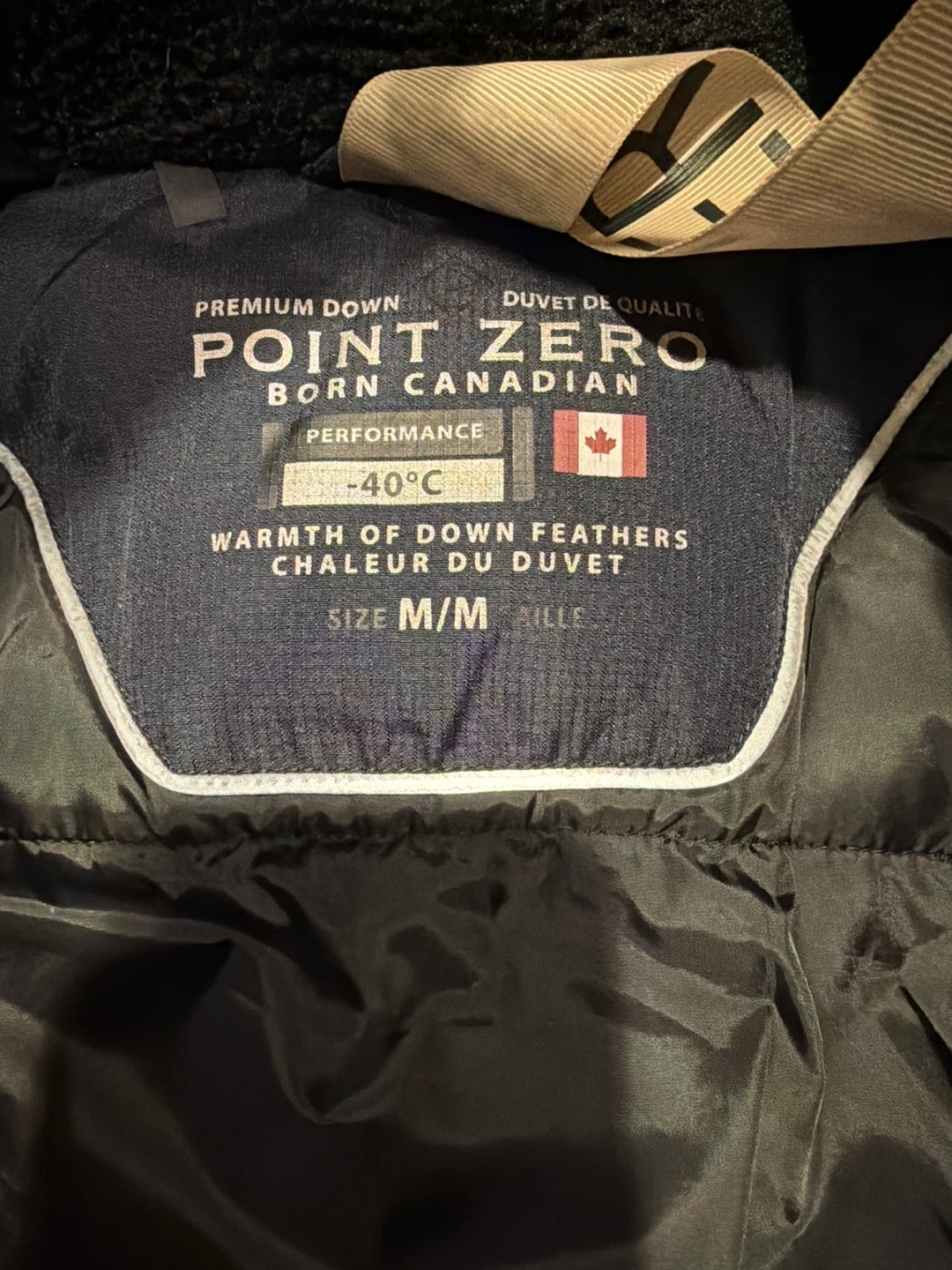 This Point Zero navy parka jacket is designed for warmth with premium down insulation. It's rated for temperatures down to -40°C. The jacket's size is M/M.