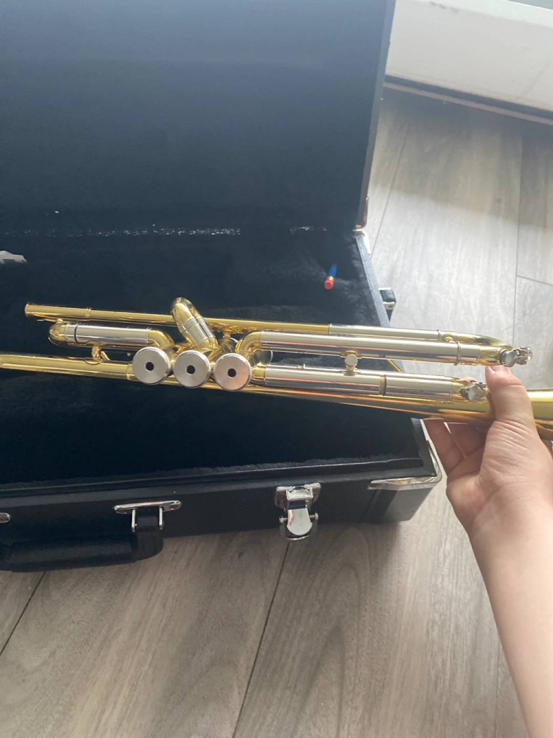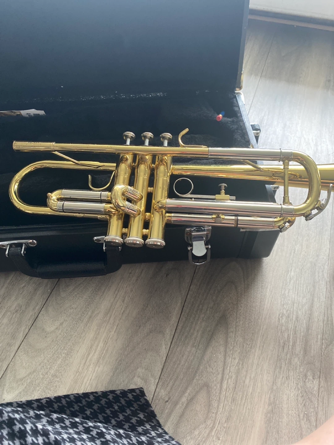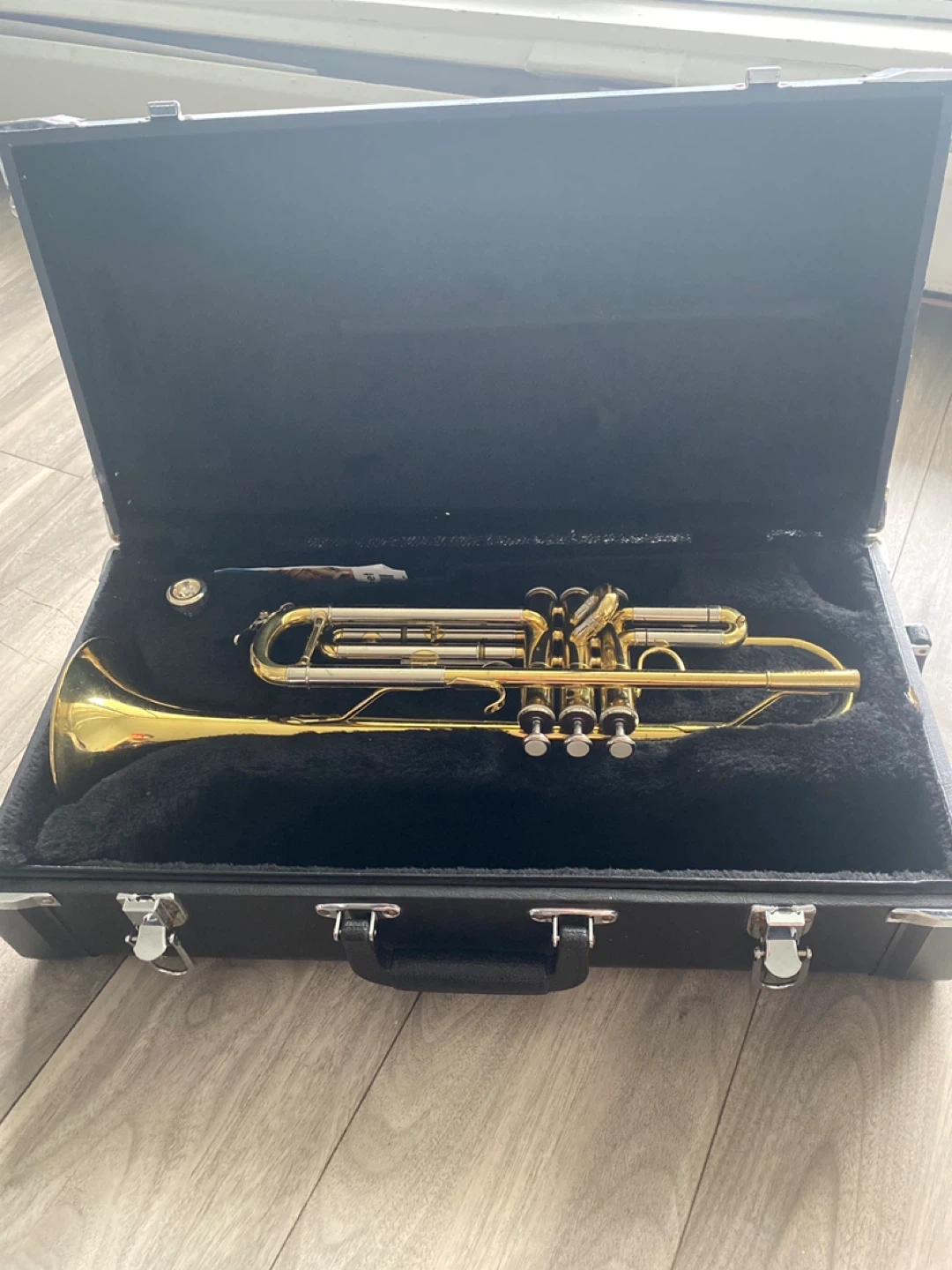 Gold coloured trumpet, comes with a black hardshell case and cleaning supplies. It has three valves. Perfect for beginner or intermediate musicians, amazing condition! price negotiable!