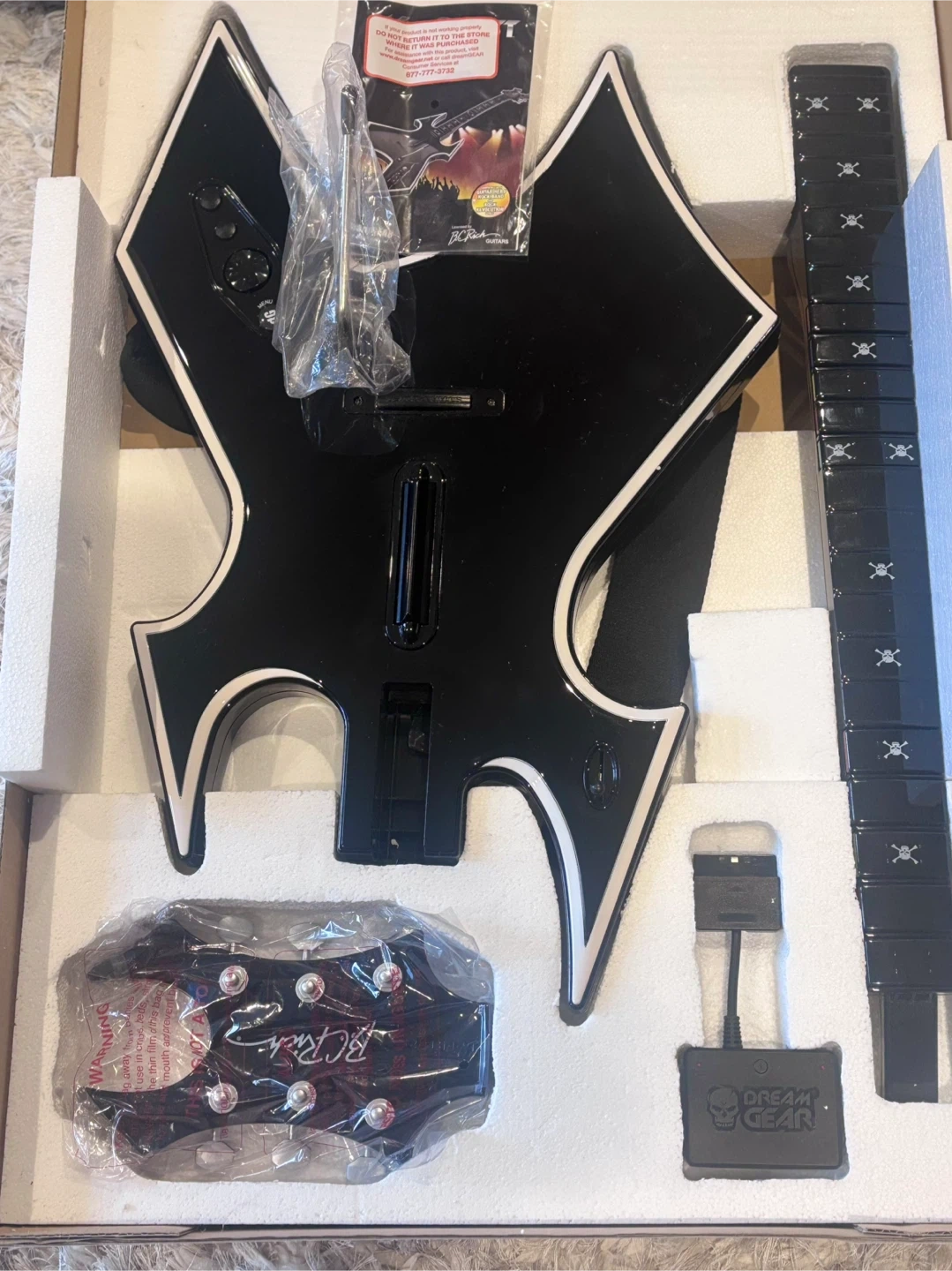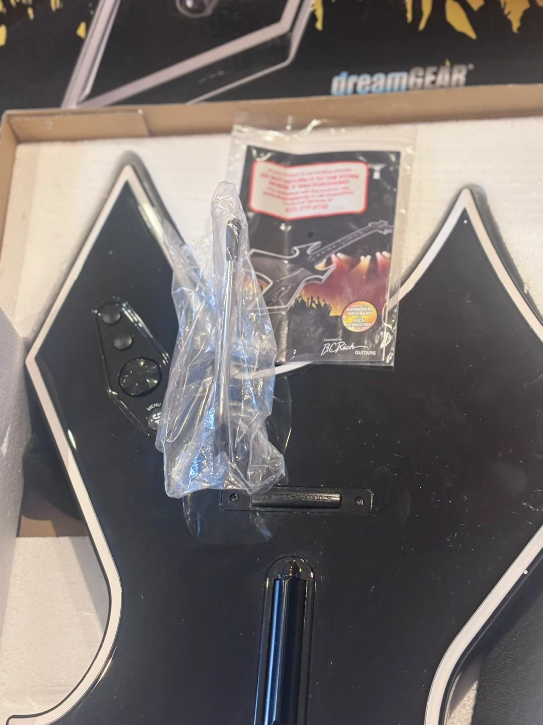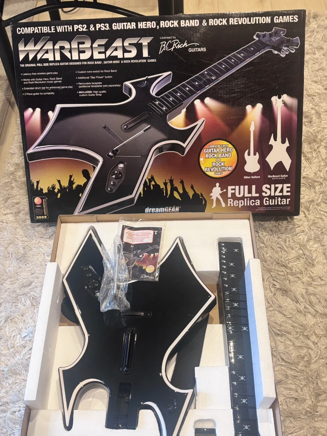 This is the dreamGEAR Warbeast BC Rich full size replica guitar designed for Guitar Hero, Rock Band, and Rock Revolution games. It's compatible with PS2 and PS3 consoles. Latency-free wireless gameplay. Extended strum bar for enhanced gameplay. Three piece guitar for portability. Custom tone switch for Rock Band. Additional Star Power button. It includes HIGH QUALITY custom guitar strap. Never used BEFORE tested it and it works great 👍 I have the original box and the instruction manual