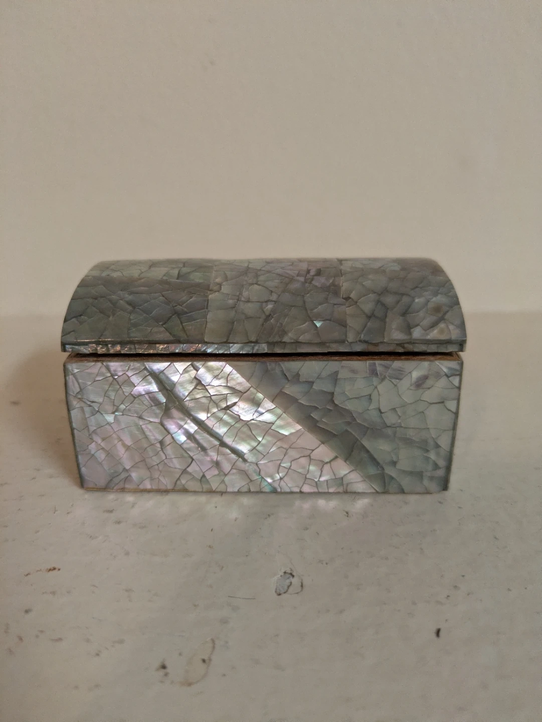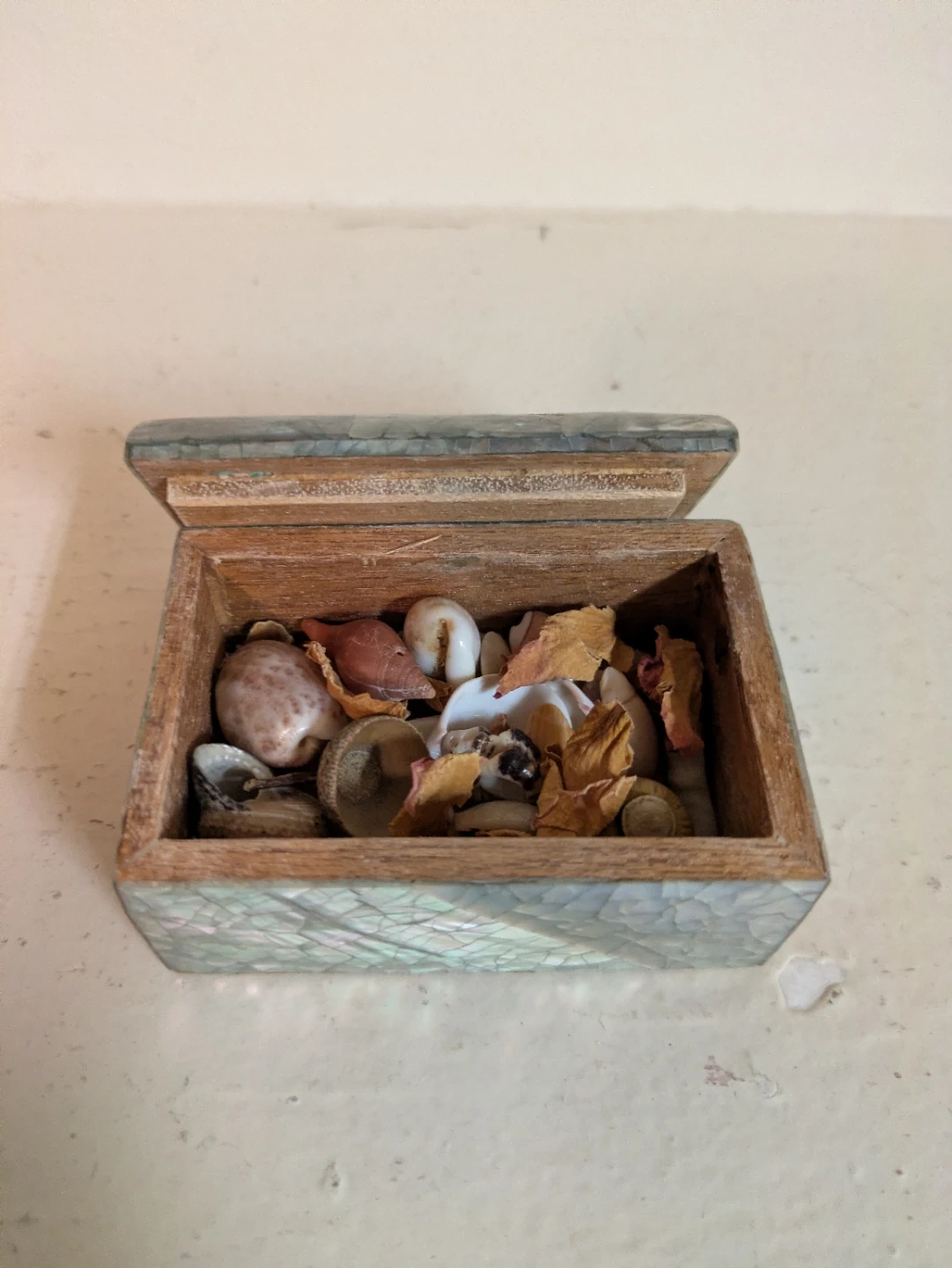 A charming decorative trinket box with an intricate mosaic shell inlay on the lid and exterior. It's filled with a collection of assorted seashells and dried botanical elements. This little box would be lovely for holding small treasures or as a unique decorative piece! Measures 3 x 2 x 1.75 inches