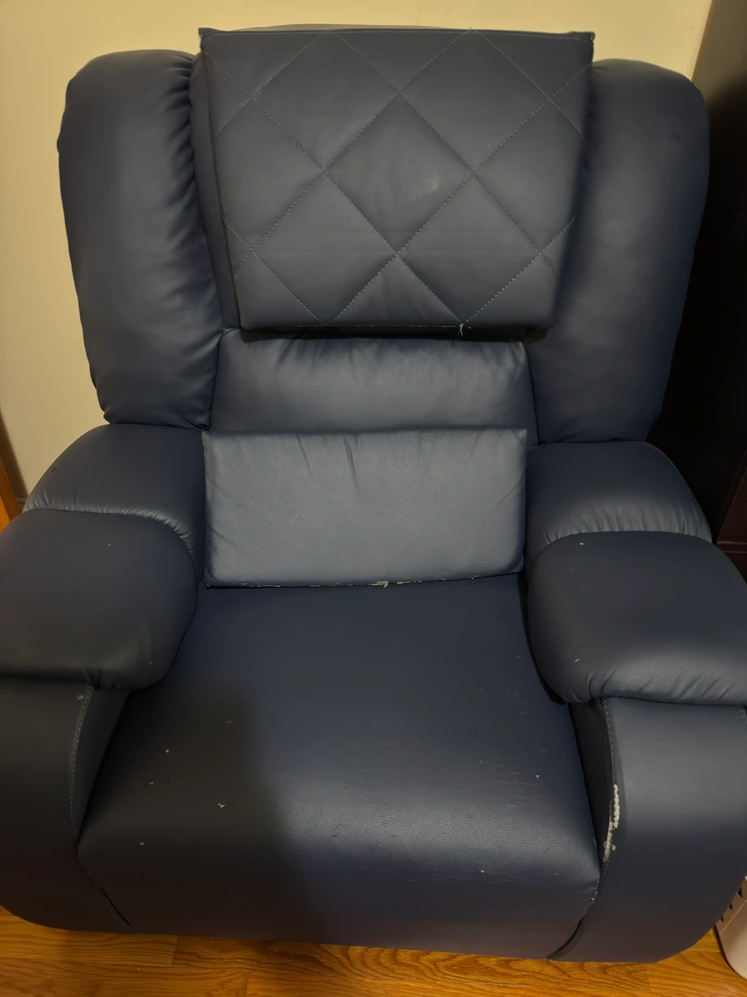 Selling a comfortable blue leather recliner chair. It has a unique design with a headrest and lumbar support. There are some visible signs of wear, as shown in the photos, but it's still a great chair for relaxing