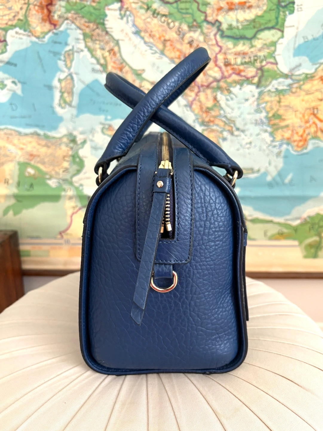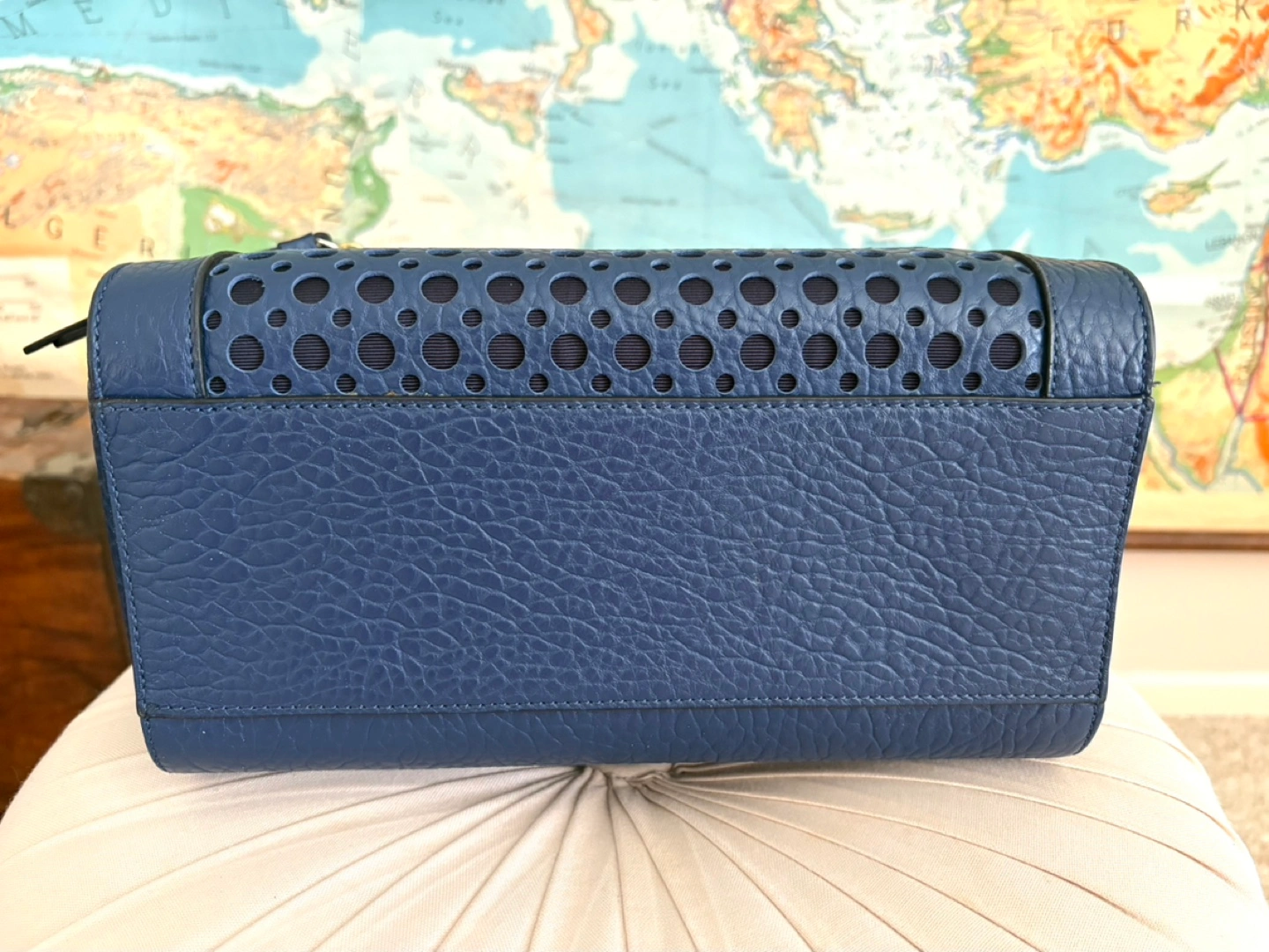 Beautiful navy blue leather satchel. Features a unique cut-out design. Double top handles and zip closure. Gold-toned hardware. Stylish and functional.