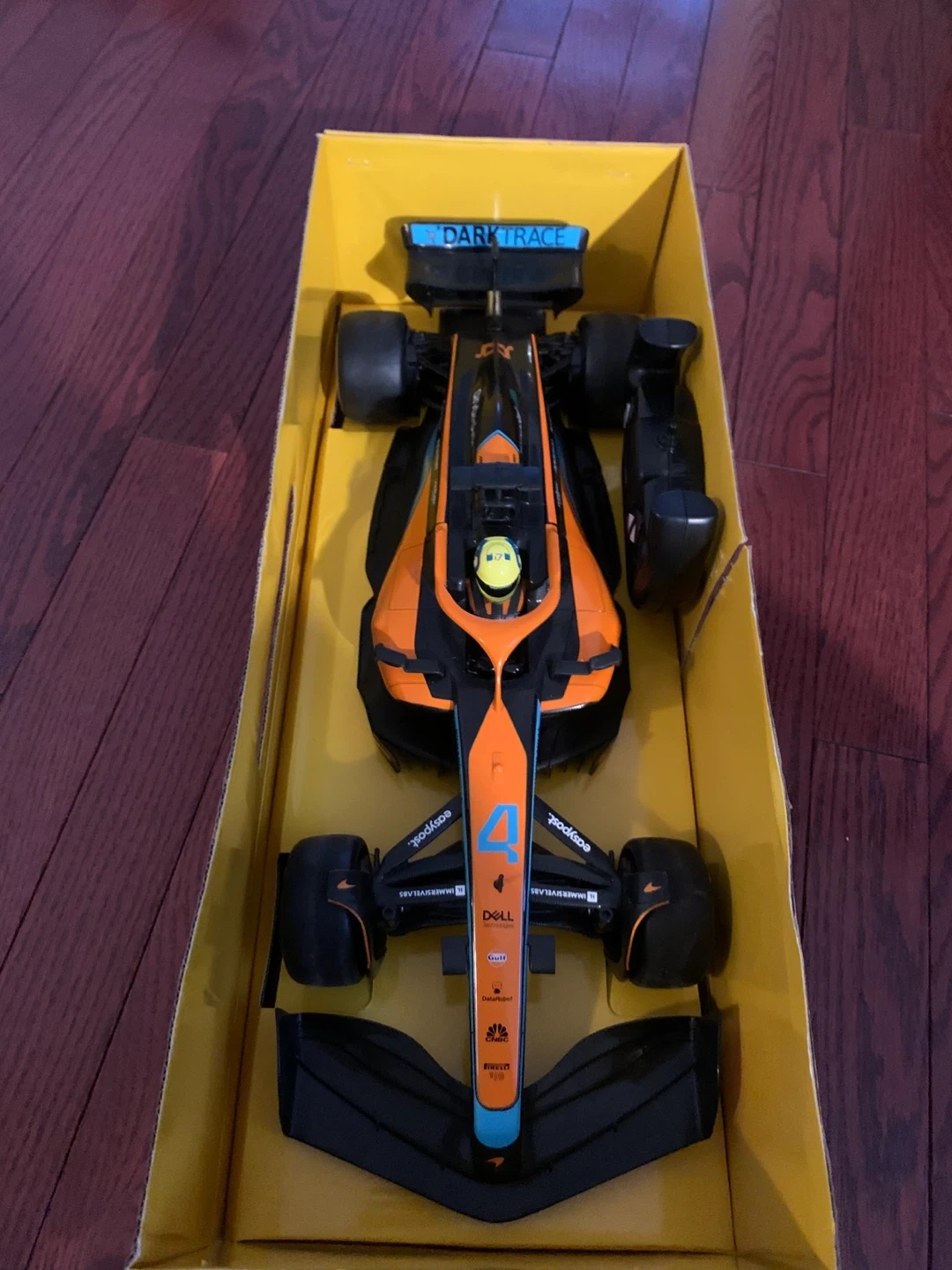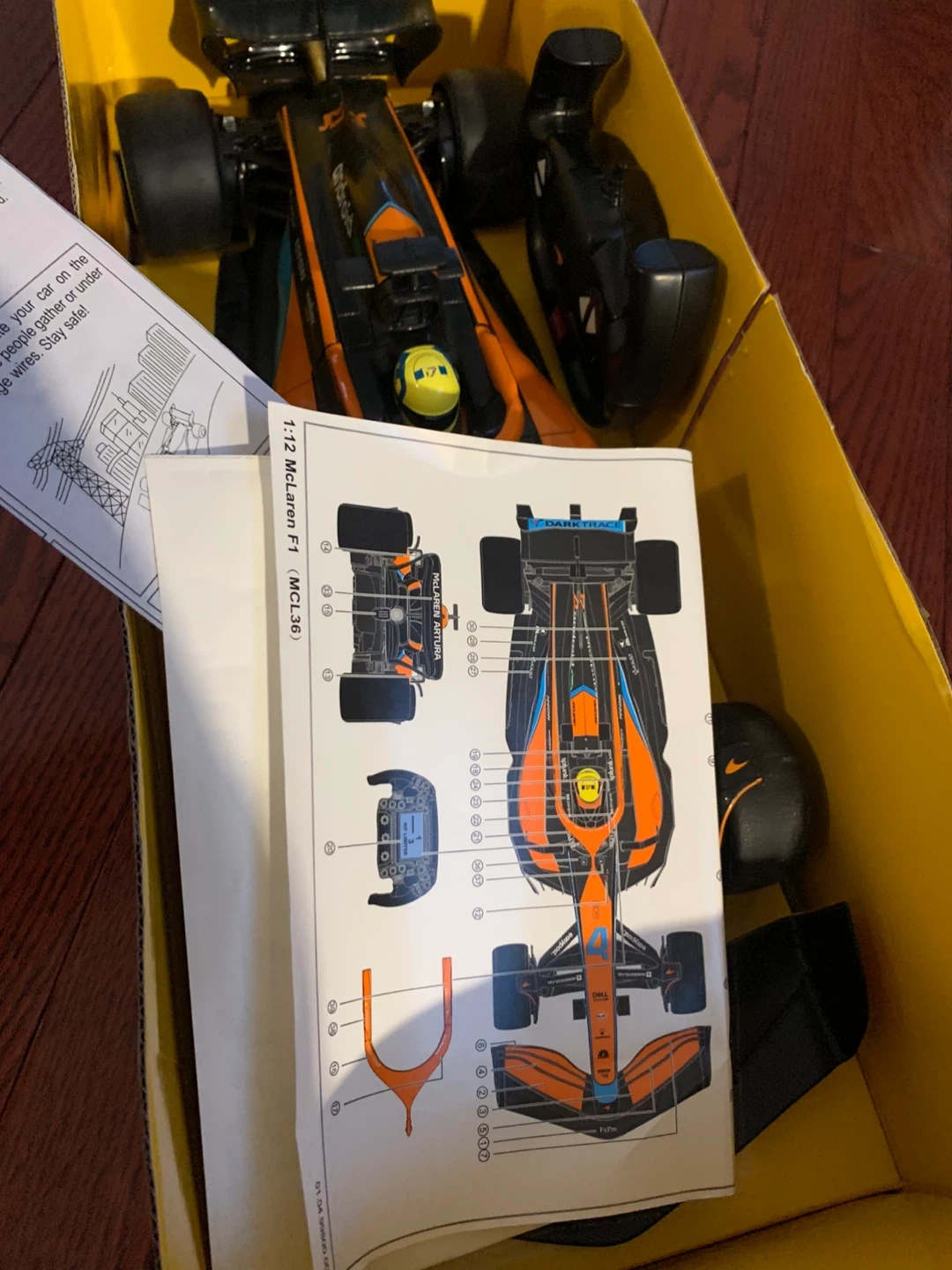 This is a 1:12 scale remote control replica of the McLaren F1 race car. It's orange and black with sponsor decals. Includes a remote controller and a sticker sheet.