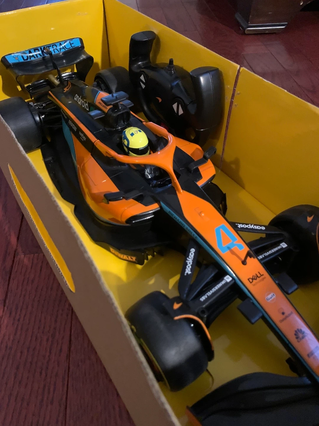 This is a 1:12 scale remote control replica of the McLaren F1 race car. It's orange and black with sponsor decals. Includes a remote controller and a sticker sheet.