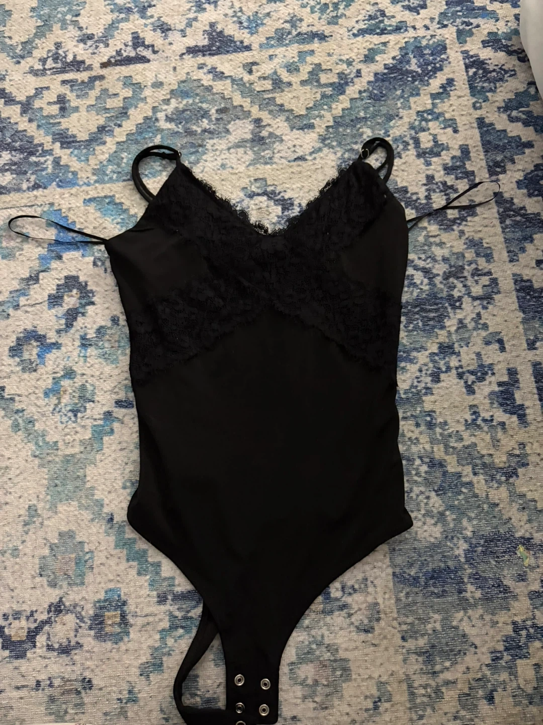 Black lace trim bodysuit with adjustable spaghetti straps. It's made with a blend of fabrics for comfort. The bottom has snap closure.